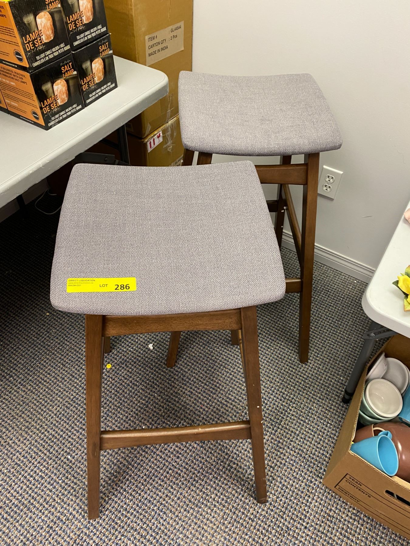 Two Wood Bar Stools with grey fabric seat - 30in tall