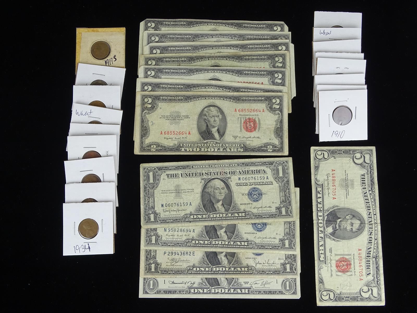 INCLUDES SILVER CERTIFICATES, $2 & $5 RED SEAL NOTES, MIXED DATE LINCOLN CENTS