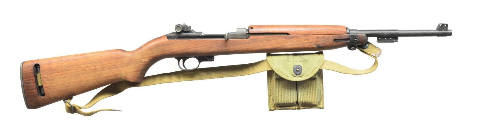 Cal. 30 Carb. S# 512394. Bbl. 18" marked behind front sight "INLAND MFG. DIV. GENERAL MOTORS 43". Milled adj. aperture rear sight marked "H.I.". Blade front sight w/ protective ears. Bbl. band w/ bayonet lug marked "SI". Straight cut slide marked "PI". Milled trigger guard marked "INLAND". Push button safety. Mag. catch marked "WA". Straight cut hammer marked "W.I." Flat bolt marked "AI". High wood oval cut walnut stock set w/ 2 rivet handguard marked "SHB". Buttstock marked only w/ "IO" in sling slot. Khaki colored web sling. MAGS: 2 - 15 rd. marked "IA" & "AI". UNATTACHED ACCESSORIES: Biscayne Tent & Awning Co. 1943 dated dbl. mag. pouch. CONDITION: stock set has been cleaned & finish removed w/ very light wear & scattered handling marks. Metal retains 90% arsenal rework finish w/ light wear & handling marks. Very good shiny bore. (20-3387/RW). CURIO. $400-600.