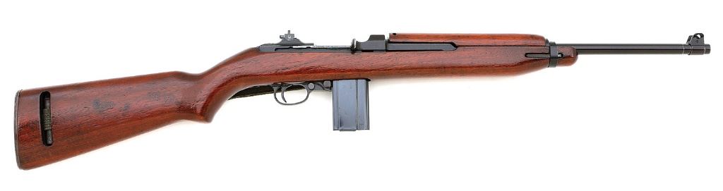 serial #3536113, 30 Carbine, 18'' Saginaw barrel with a bright very good bore with some light pitting at the muzzle but strong rifling throughout. The metal surfaces retain about 92% arsenal reapplied Parkerized finish with light wear on high edges and contact points, light thinning on the bolt and triggerguard bow, and some light toning to brown under bright light; a few spots show some previous pinprick pitting beneath the finish. The low-wood oval-cut walnut stock and 2-rivet handguard are in very good condition with an added glossy finish and some scattered light handling marks, the right side of the stock showing a faint boxed ''S.G.'' and Ordnance Wheel, the sling cut with a light ''R.S.G.'' maker mark above ''99F'', and the underside of the handguard is lightly ''OI'' marked. The receiver and barrel markings are intact and crisp and the marked parts all appear to be Saginaw-made, save for the hammer which appears lightly cleaned with no markings evident. The carbine features the two-position aperture rear sight, flat bolt, button safety, and Type I barrel band. Included is a single QU-marked 15-round magazine in excellent condition. A Saginaw carbine in largely original configuration. (14A11700-16) {C&R} (1200/1800)