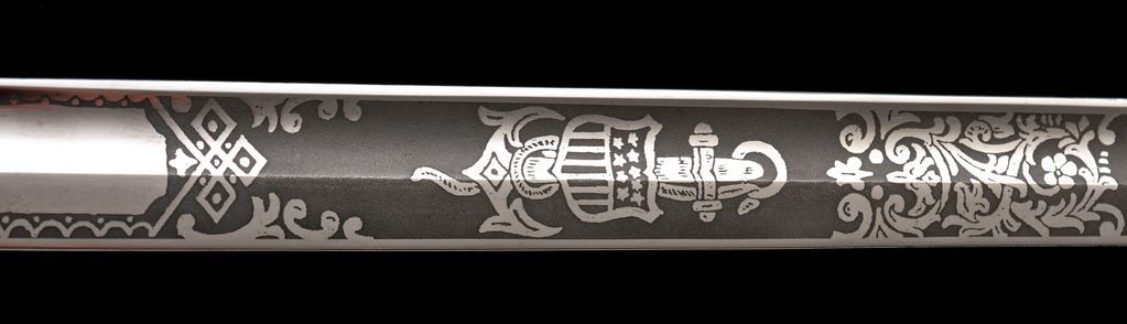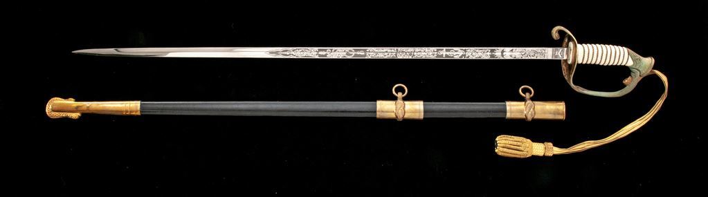 U.S. M1852 Navy Officer's Sword, with Knot, ca. 1950's-60's, 31" nickel-plated and etched decorated blade is maker marked at the ricasso to Wolf-Brown, and marked "Germany" and "stainless". Etched designs feature "U.S.N", fouled anchor, floral motifs, eagle, and circle of stars. The area for naming is blank. Brass hilt is decorated with pierce designs of oak leaves and acorns, and U.S.N. The finger guard is a stylized dolphin as is the quillion. Grip is white plastic with simulated rayskin bumps and triple twisted wire wrapping. Pommel features the American eagle, with nice gold bullion sword knot. Scabbard is metal with a black leather covering, brass drag, and hanger fittings. Condition is very good, the blade almost mint with a little dried grease at the tip, the original white felt blade washer is present. Top and one side of the guard and pommel have some green oxidation that may clean with a little sudsy ammonia. Grip is in nice condition with all the wire wrapping intact and tight. Knot is very nice. Scabbard is excellent with very minor lines and pinprick spots in the leather; brass fittings retain most of their gold gilt finish, toning somewhat. Est.: $200-$400.