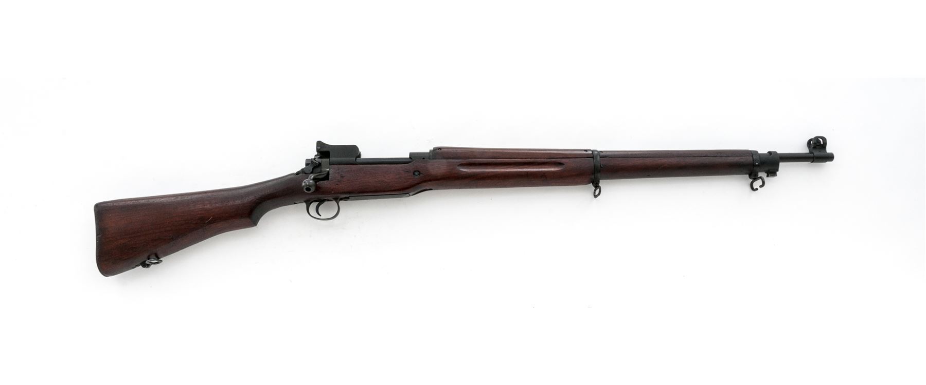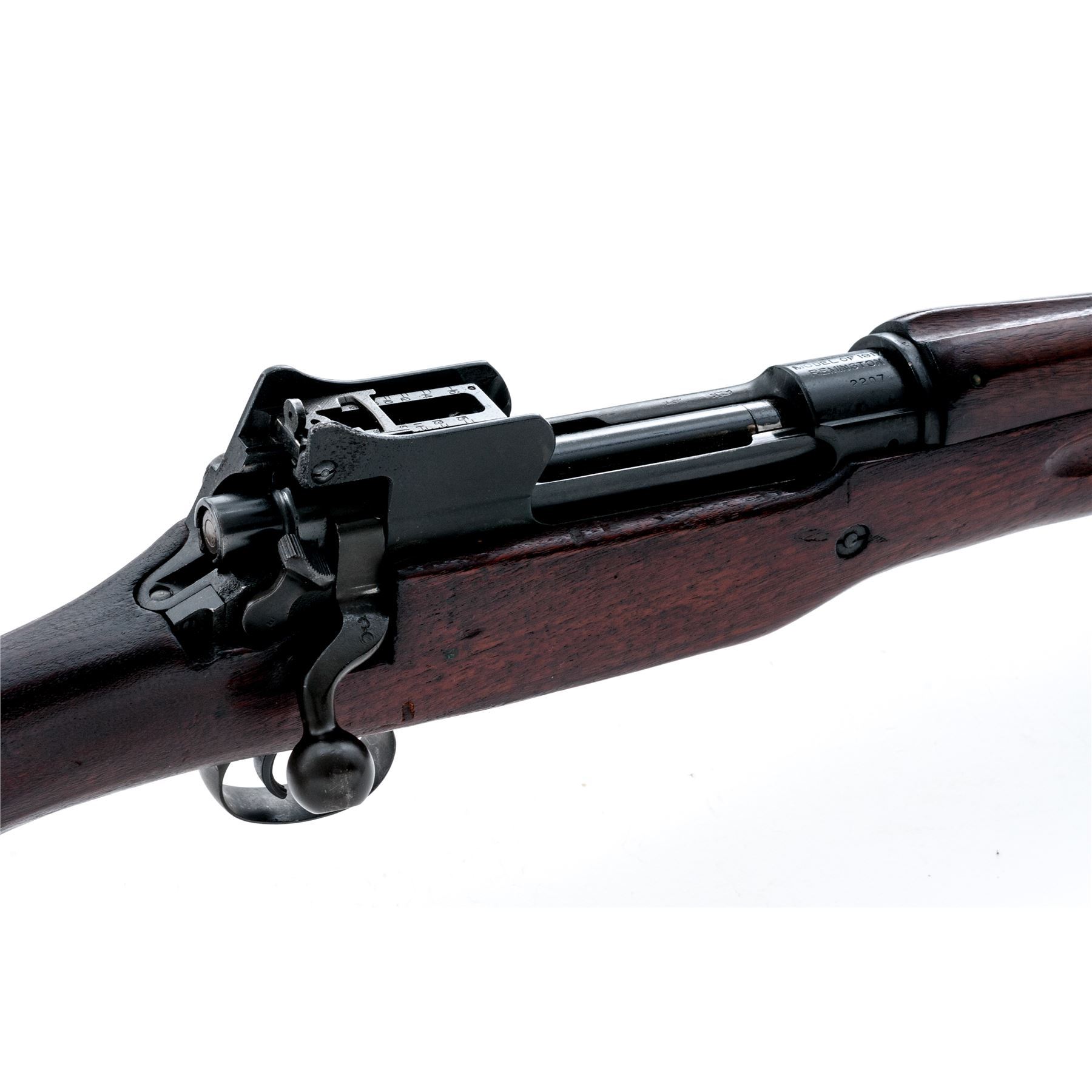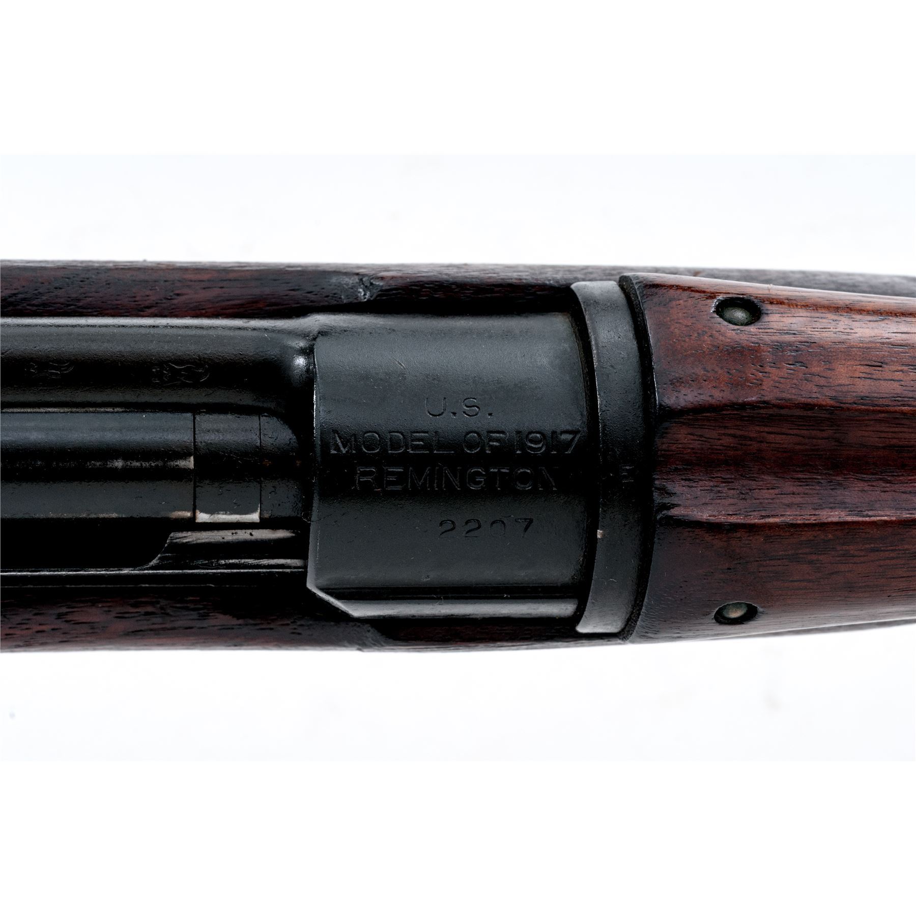 U.S. M1917 Enfield Bolt Action Rifle, #2207, .30-06 cal., 26'' barrel, parkerized/blued finish, walnut stock, blade front sight with protecting ears and folding leaf rear sight with aperture. Marked on receiver ring ''U.S. MODEL OF 1917 REMINGTON'', and on barrel behind front sight ''R/(flaming bomb)/11-18''; ''R'' stamp on underside of bolt handle. Forend tip has no letter stamp. ''RA-P'' and ''AAB'' cartouches stamped on left side of stock. ''Circle ''P'' firing proof on underside of wrist. Condition overall is very good with approx. 98% of the refinished bluing/parkerizing remaining on the metal, which was applied over an area of old pitting on the receiver. Wood is very good with a couple of small impact marks and an overall dark color. Action is smooth, bright bore is excellent. No visible import marks. Est.: $400-$600. (C&R)
