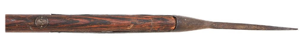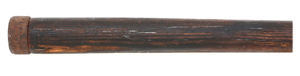 This pike measures 80 1/2'' overall and the forged-steel head is of the third type measuring 18 1/2'' overall with a 6 7/8'' quadrangular spike and 8 7/8'' dual rectangular langets having three evenly spaced holes for attachment to the haft. Although commonly known to collectors as the ''U. S. Navy Model of 1816 Boarding Pike'' and even though the US Navy contracted for a great number of boarding pikes during 1816, there was no ''official'' 1816 pattern and these type III spike head pikes were indeed used from the War of 1812 right up to the Spanish-American War with production ceasing in the mid-1860's, there are however, no visible inspector markings which are found on M1812 heads. The haft is double tapered measuring approximately 4'' at the biggest swell of the head and butt narrowing to 3 1/4'' in the mid-section. The wood shaft has been inlet to accommodate the langets and the butt has been cut and fitted with a 1 5/16'' iron ring and a shaped treated wooden plug attached with a brass screw. The head has a dark brown iron patina with scattered light oxidation and traces of the original blackened finish. The langets are currently attached with one screw on each side and have bowed slightly and are tapered at the ends leaving the metal shy of the wood. The iron ring has a finish matching the head and no longer seats firmly but remains present. The wood haft appears to be ash having a dark, red-brown finish with light dents and marks and traces of original white paint. Mounted to the haft is a brass disc with ''98'' inside of a beaded border, possibly a rack number or some or type of identification. A fine example of these 19th century boarding weapons. (5B11738-OW9) [John A. Micavich Collection] (1200/1800)
