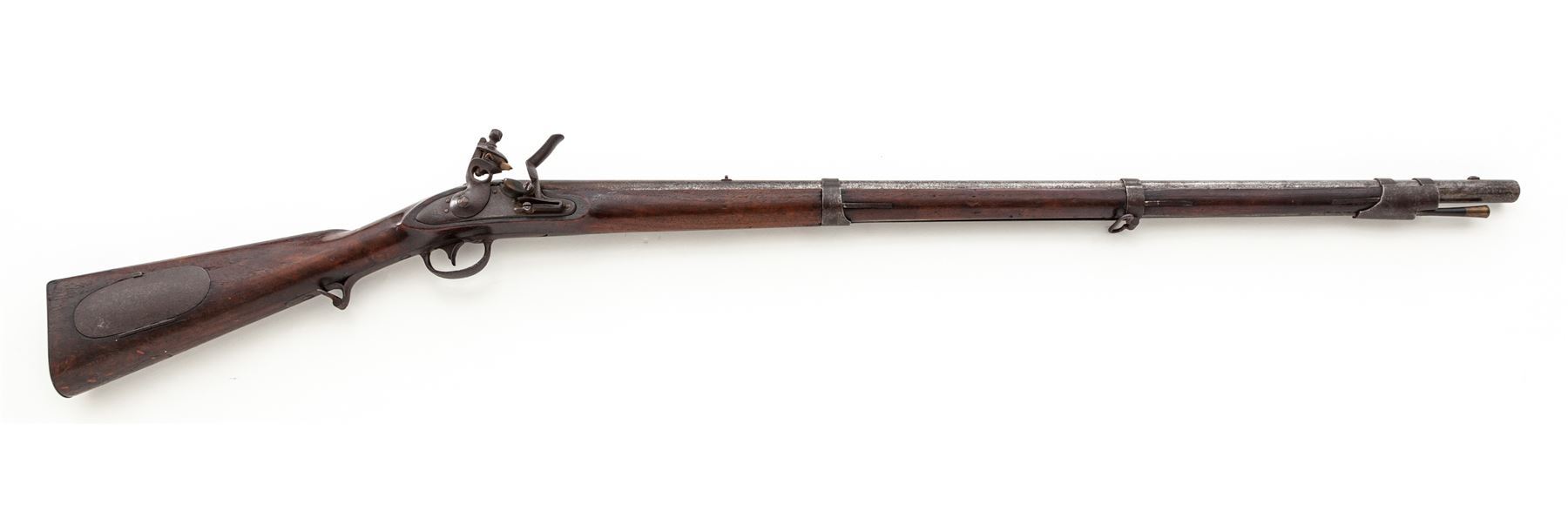 U.S. Model 1817 Flintlock ''Common Rifle'', 1840 Contract by Nathan Starr & Son, NVSN, .54 cal., 36'' barrel, with small block-blade front and dovetailed notched rear sights, marked ''NWP'' (military inspector Nahum W. Patch) over an impressed ''P'' proofmark at breech; bevel-edge lockplate with rounded-pointed rear is marked ''Middtn/Conn/1843'' vertically behind flint cock (any other barrel or lockplate markings likely obscured by black powder pitting), has separate brass flashpan and iron cock with straight top-jaw guide; iron furniture including oval patchbox opening to a trap in butt for patches and spare parts, serpentine sideplate, three barrel bands (front of double-strap type, middle with sling swivel), triggerguard with long rear tang having a scrolled sling swivel lug, curved buttplate, and ramrod with brass trumpet-type head; oil-stained walnut fullstock. Mfg'd ca. 1843 in full-browned finish but for case hardened lockplate, in quantity of only 6,000 guns. Rifle appears to be in original flintlock configuration, with all original parts and unbushed touchhole. Condition is very good for its age and type, with metal surfaces showing an overall brown-gunmetal color with general moderate-to-deep age and black powder pitting. Stock is sound and smooth with light use marks, a half-inch chip at middle band, tight grain, good color, and two nice military inspectors' marks to left of lock: ''JH'' (probably Joseph Harniss) and ''WAT'' (William A. Thornton) in oval cartouches. Action is very strong; bore is clean with deep 7-groove rifling. Est.: $1,500-$2,000. (Antique)