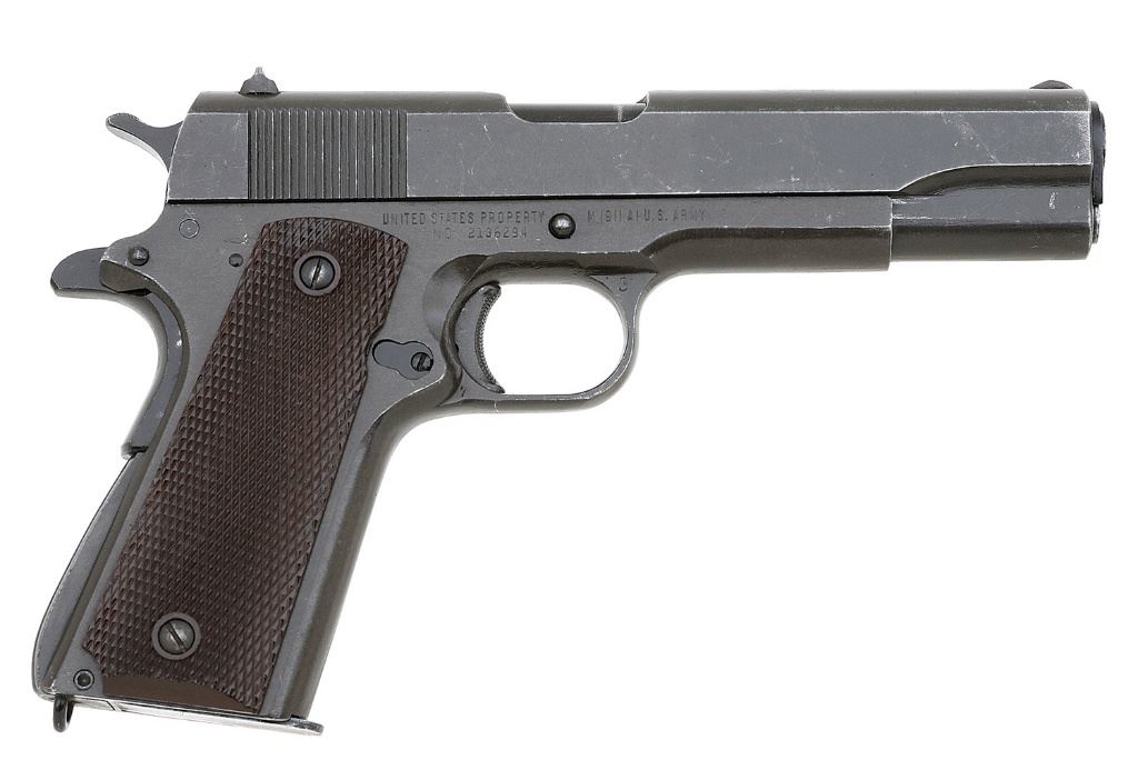 serial #2136294, 45 ACP, 5'' High Standard barrel with an excellent bore. This pistol features an Ithaca slide, is likely Arsenal rebuilt, and it remains in excellent condition. The metal surfaces retain about 97% original Parkerized finish with sandblasted blue on the controls showing light scattered edge wear and a few handling marks. The checkered synthetic Keyes Fibre grips feature reinforcing ribs on the back, reinforcing ribs around the screw holes, and remain in excellent condition. The small parts and markings appear correct for the respective frame and slide, Col F.J. Atwood's inspection mark as well as the various proofs and ordnance wheel remain crisp. It includes a faux Ordnance-style craft box for an Ithaca Model 1911A1 and is numbered to this gun, a single Colt seven-round commercial magazine, and a single Scovill Manufacturing marked seven-round magazine with welded floorplate. An excellent 1911A1. (8A11694-10) {C&R} (1200/1800)