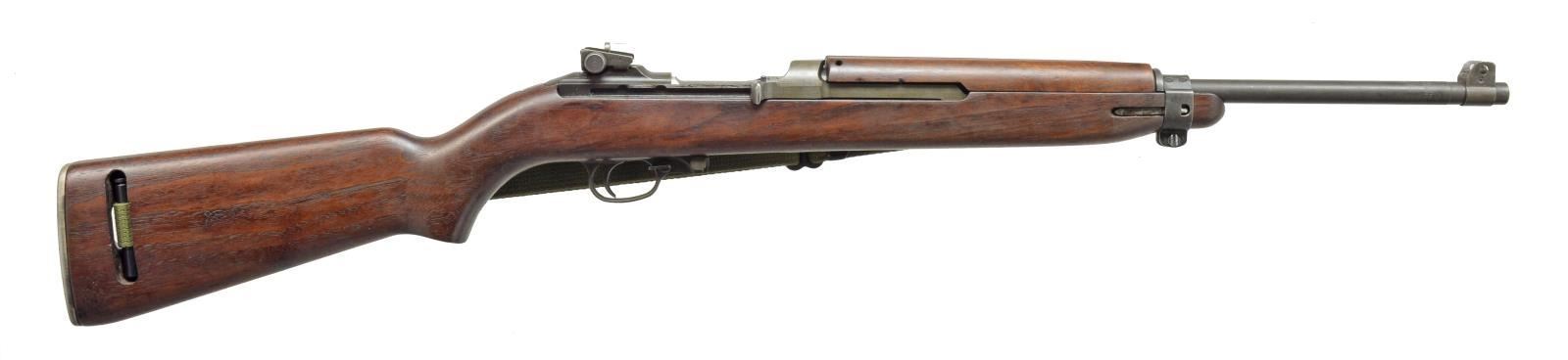 Cal. 30 Carb. S# 6346794. Bbl. 18”. Mfg. Inland. Very nice condition Inland Carbine. Undated bbl. marked behind front sight, “INLAND MFG. DIV. GENERAL MOTORS”. Stamped adj. rear sight, “L.R.C.O.”. Blade front sight w/ protective ears marked “N”. Bbl. band w/ wire swivel marked “AI”. 6 O’clock slide marked “PI”. Flat bolt marked “IO”. Milled trigger groove marked “Inland”; rotary safety, Mag. catch marked “EI”; straight cut hammer marked “W”. Oval cut low wood walnut stock marked “IO” in sling slot. Marked “P” under grip; mark “S” at end of pistol grip. Buttstock marked on right side w/ crossed cannons; 2 rivet hand guard marked “IO”. UNATTACHED ACCESSORIES: green web sling. CONDITION: stock set has excellent appearance w/ very light wear & scattered handling marks. Metal has 80% parkerized finish w/ thinning & light wear. Very good shiny bore. (20-3529/RW). CURIO. $400-600.