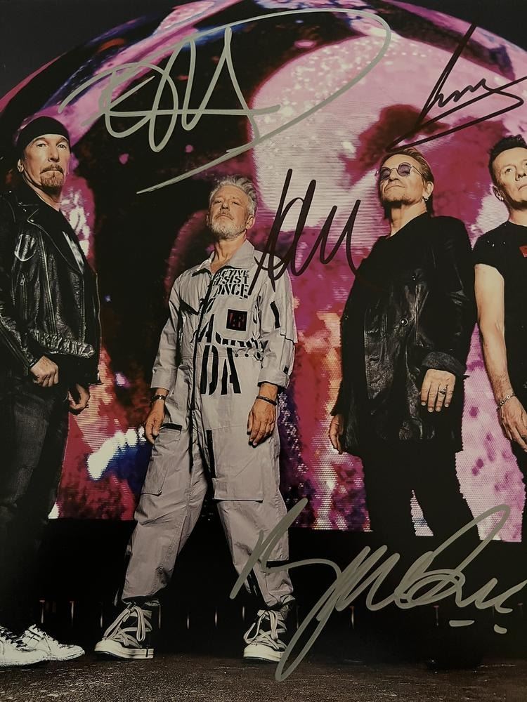 U2 band signed photo autographed by Bono, The Edge, Adam Clayton and Larry Mullen Jr. 8x10 inches