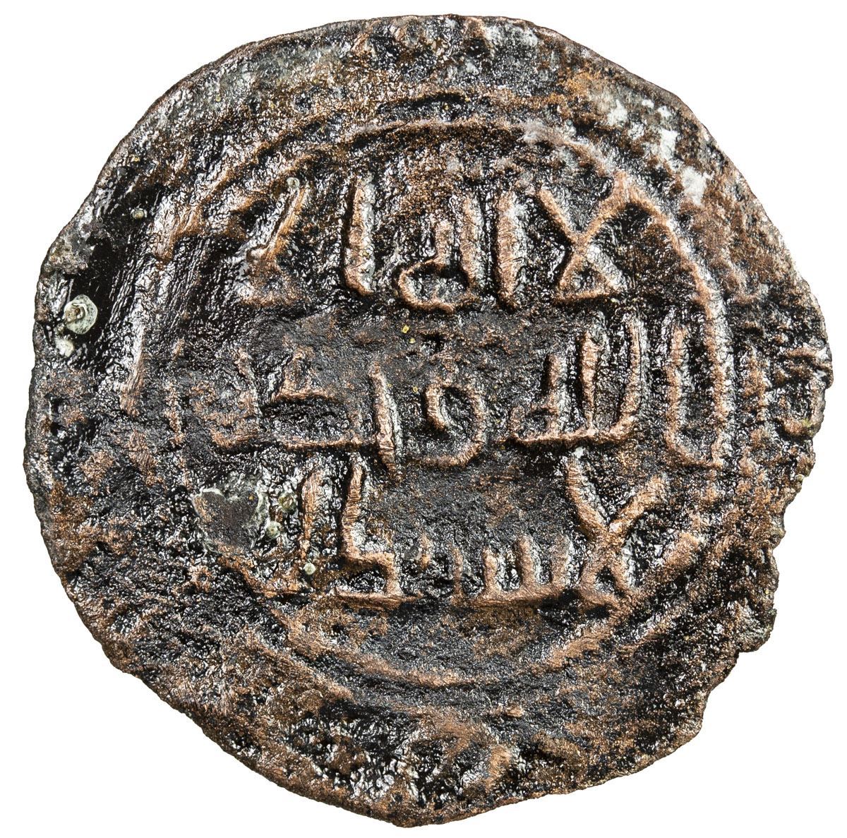 UMAYYAD: AE fals (1.06g), al-Daybul, AH117, A-199D, citing the kalima divided as usual on Umayyad copper coins, with the reverse marginal legend bism Allah duriba hadha al-fals bi 'l-dâybul sanat sab ' 'ashara wa mi 'a, no marginal legend on the obverse, some porosity and erosion from having been in the salty soil in Sind, expertly cleaned by the consignor, Fine, RRRR.