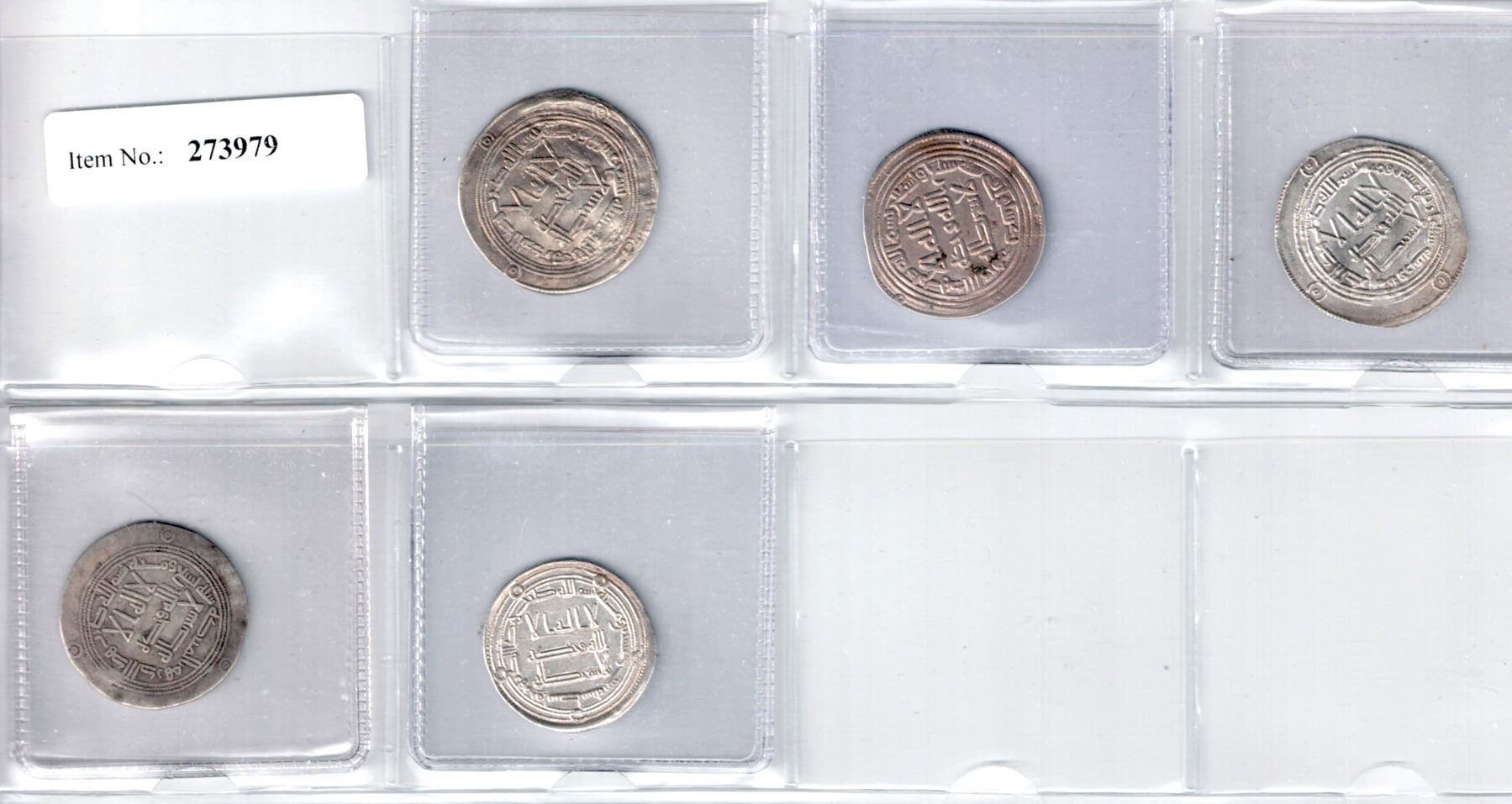 UMAYYAD:LOT of 5 silver dirhams: al-Bab AH119 (Fine, mount removed); Dastawa 97 (F-VF); Ifriqiya 114 (VF-EF, lightly clipped); al-Mubaraka 109 (Fine); and Wasit 126, 5 annulets (EF-AU); retail value $425, lot of 5 pieces.
