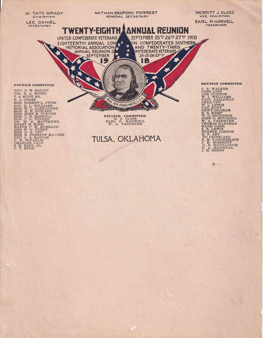 Official stationary of the United Confederate Veterans 28th Annual Reunion held in Tulsa, Oklahoma in 1918. Letterhead has a list of the members of the reunion committee and an illustrated portrait of Brigadier General Stand Watie surrounded by Confederate flags. 8.5 x 11 inches. The UCV was formed in 1889 by ex-soldiers of the Confederate Militia in response to the Union's veteran group, the Grand Army of the Republic. Lower half of page has minor loss.