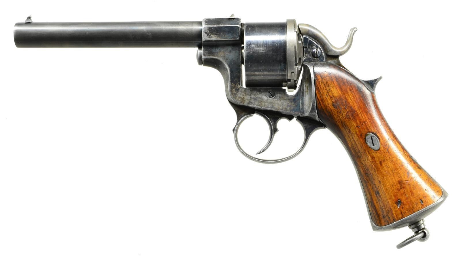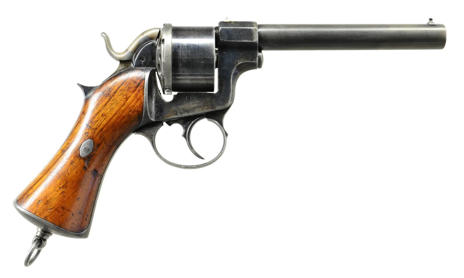 Cal. 11mm CF. NSN. Bbl. 5 5/8" rnd. w/ bead front sight & fixed U notch rear sight. Six shot rnd. cyl. Blue finished action w/ case colored center mounted hammer. Two piece walnut grips w/ lanyard ring at butt. Bbl. & action are unmarked. CONDITION: 50% dull fading blue w/ areas turning gray. Grips have worn finish showing dents & handling marks. Sound mechanics. Pitted bore retains intact rifling. (01-20895/DS). ANTIQUE. $250-500.