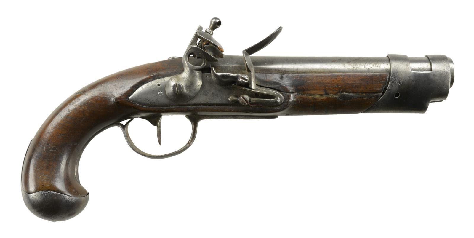 STYLE. Cal. 69. NSN. Bbl. 6" smoothbore w/ "G" stamped left side breech. Unmarked lock. Walnut stock w/ iron French style bbl. band, buttcap, trigger guard & side plate. Left ear of stock behind side plate is stamped "20". Consignor states pistol is War of 1812 era. CONDITION: good overall condition. Cleaned metal has gray patina & pitting, Good stock varnish w/ deep gouges, moderate marks throughout, lg. repaired crack extending from lock to bbl. band & a few sm. cracks. Dark pitted bore. (01-20402/MD). ANTIQUE. $300-400.