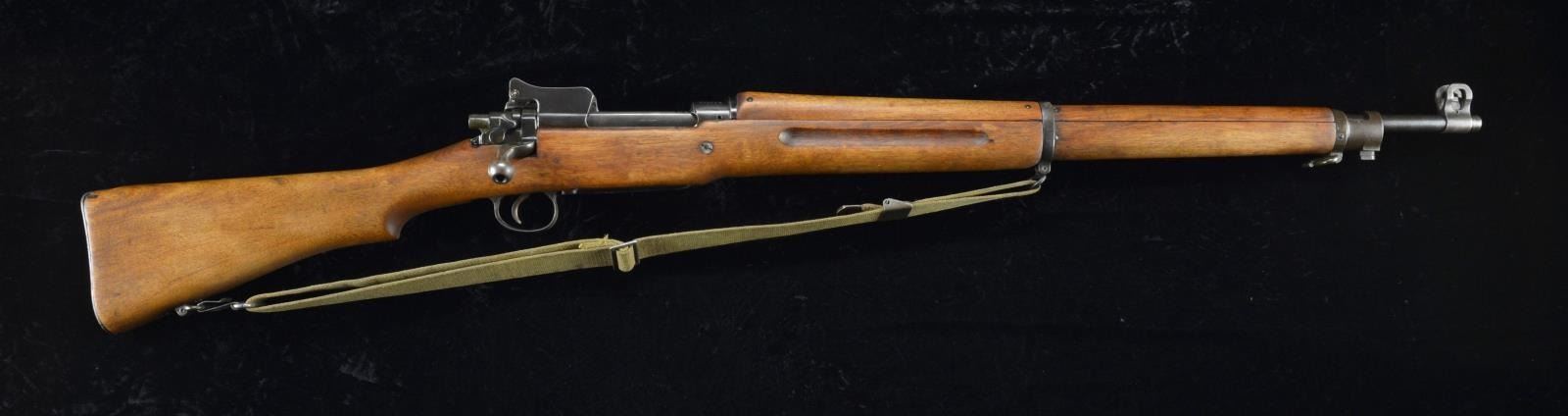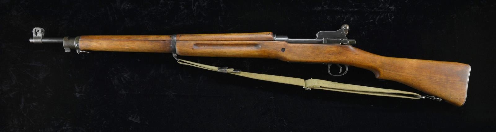 Cal. 30-06. S# 301114. Bbl. 26". Classic Winchester 1917 w/ protective blade front sight & folding ladder aperture rear sight adj. to 1,600 yds. Bbl. marked w/ flaming bomb ordnance mark below "W" "5/18" behind front sight. W stamped bayonet lug. Ordnance marks on receiver & bolt handle. Trap door in buttplate still containing aluminum oiler. Receiver marked above chamber "U.S. / MODEL OF 1917 / WINCHESTER / 301114". Matching hardwood stock & heat shields. Green canvas sling. CONDITION: blued finish on most exposed metal parts. Coverage is complete & consistent w/ thinning on some high areas & areas of mechanical intervention. Wood appears to have been refinished w/ no apparent areas necessitating repair. Bbl. has strong rifling w/ dark grooves. Fire control mechanism appears to function correctly when cycled by hand. PROVENANCE: from the estate collections of Charles P. Obremski. (22-1256/JZ). CURIO. $400-600.