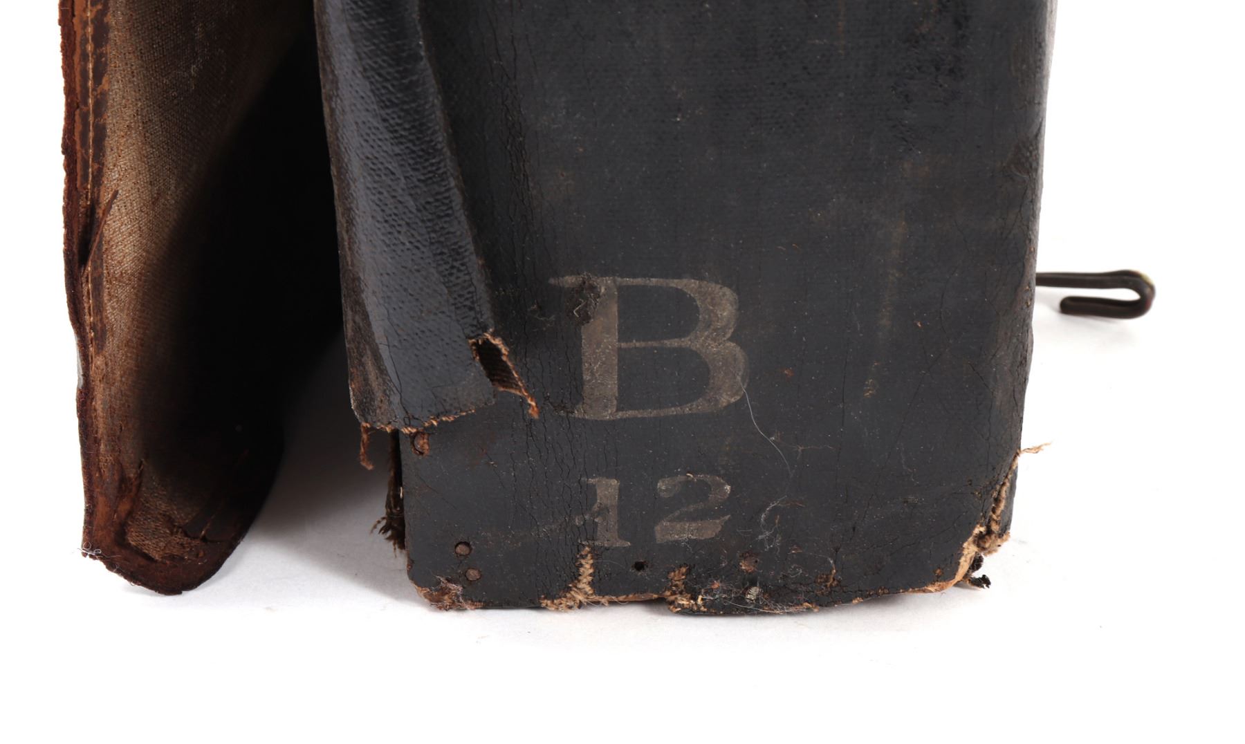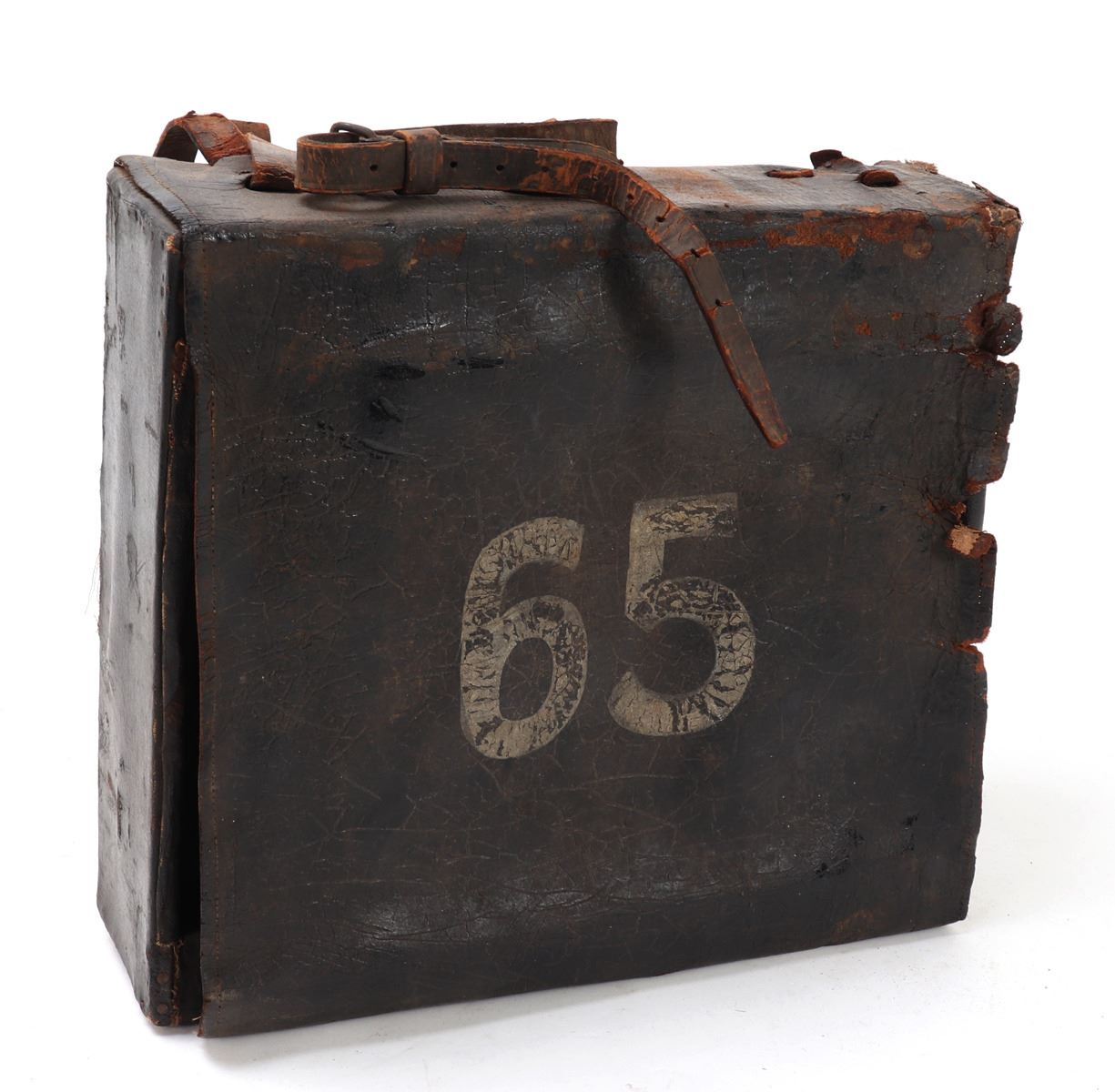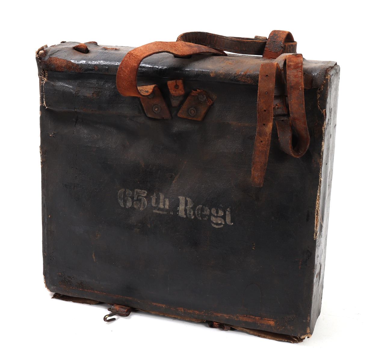 American historic Borinqueneers backpack from the 65th Infantry Army Regiment. Marked in white (B12) to the side, (65th Reg) to the back, and (65) to the front. Composed primarily of Puerto Rican soldiers in 1899 after the Spanish-American War. The regiment fought limited combat roles in WWI and later fought in WWII / Korean War. Size 14 3/4" L x 4 1/4" W x 13 3/4" H. Condition: Soiled with oxidization, tears, and wear commensurate with age and use but intact overall.. Provenance: Ex-Southern California Estate