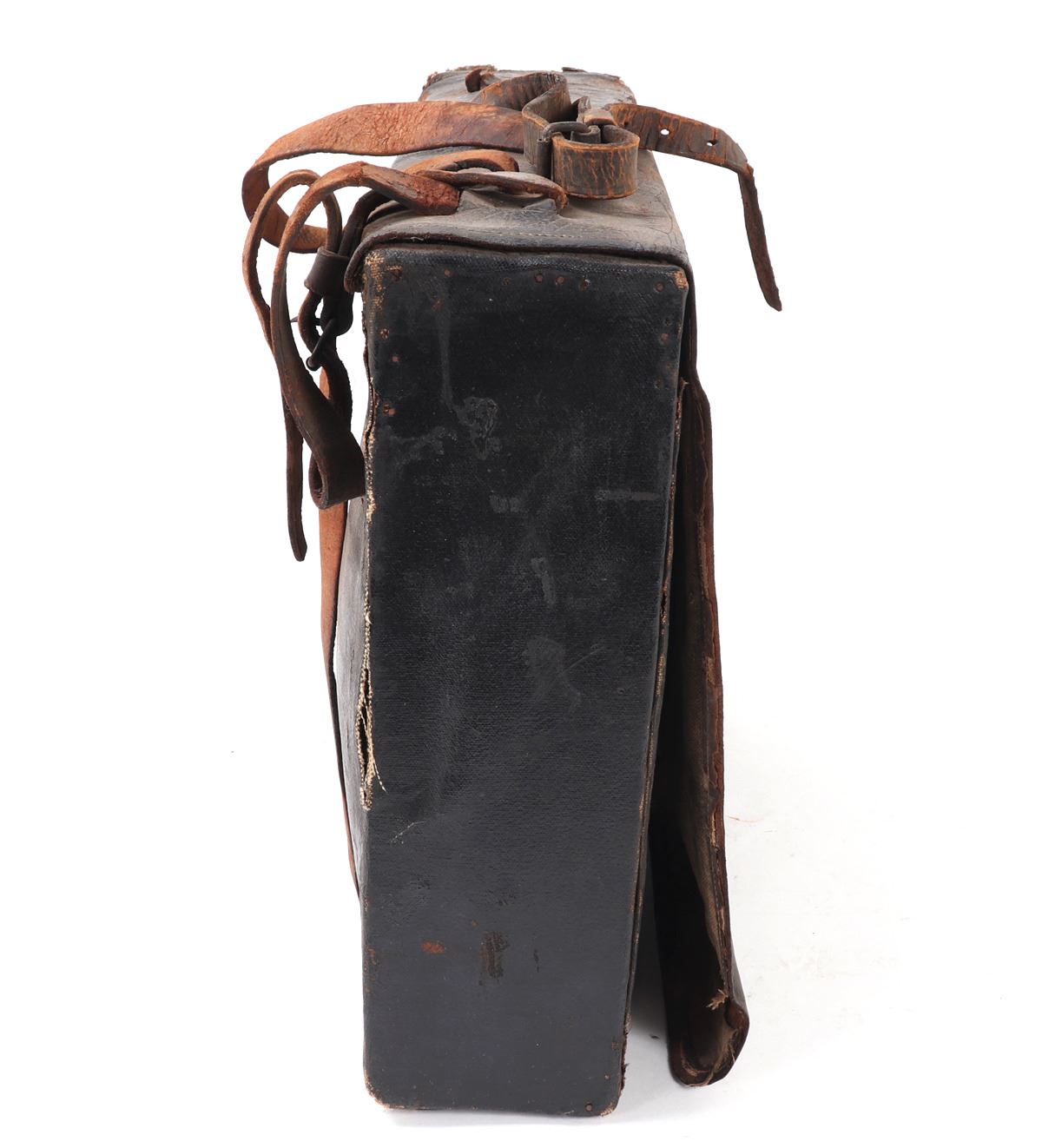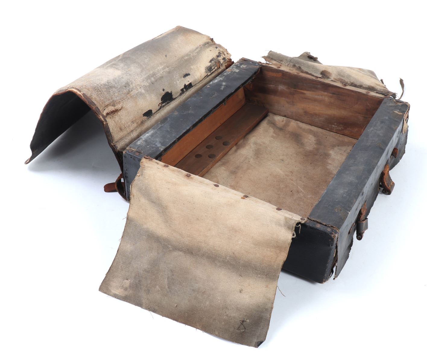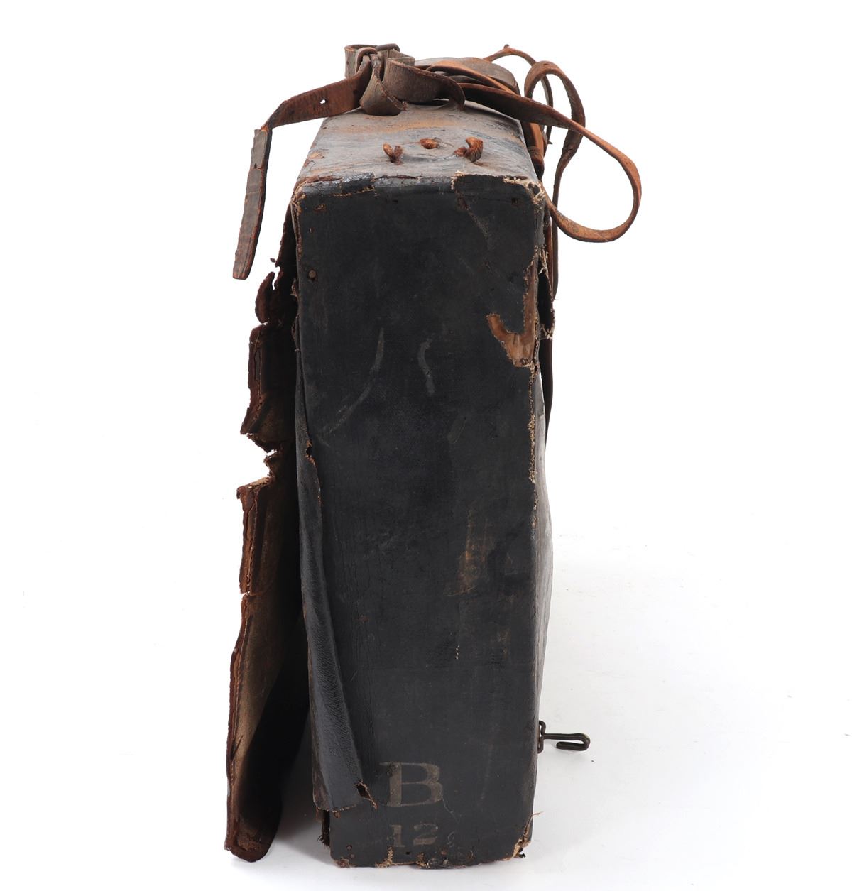 American historic Borinqueneers backpack from the 65th Infantry Army Regiment. Marked in white (B12) to the side, (65th Reg) to the back, and (65) to the front. Composed primarily of Puerto Rican soldiers in 1899 after the Spanish-American War. The regiment fought limited combat roles in WWI and later fought in WWII / Korean War. Size 14 3/4" L x 4 1/4" W x 13 3/4" H. Condition: Soiled with oxidization, tears, and wear commensurate with age and use but intact overall.. Provenance: Ex-Southern California Estate