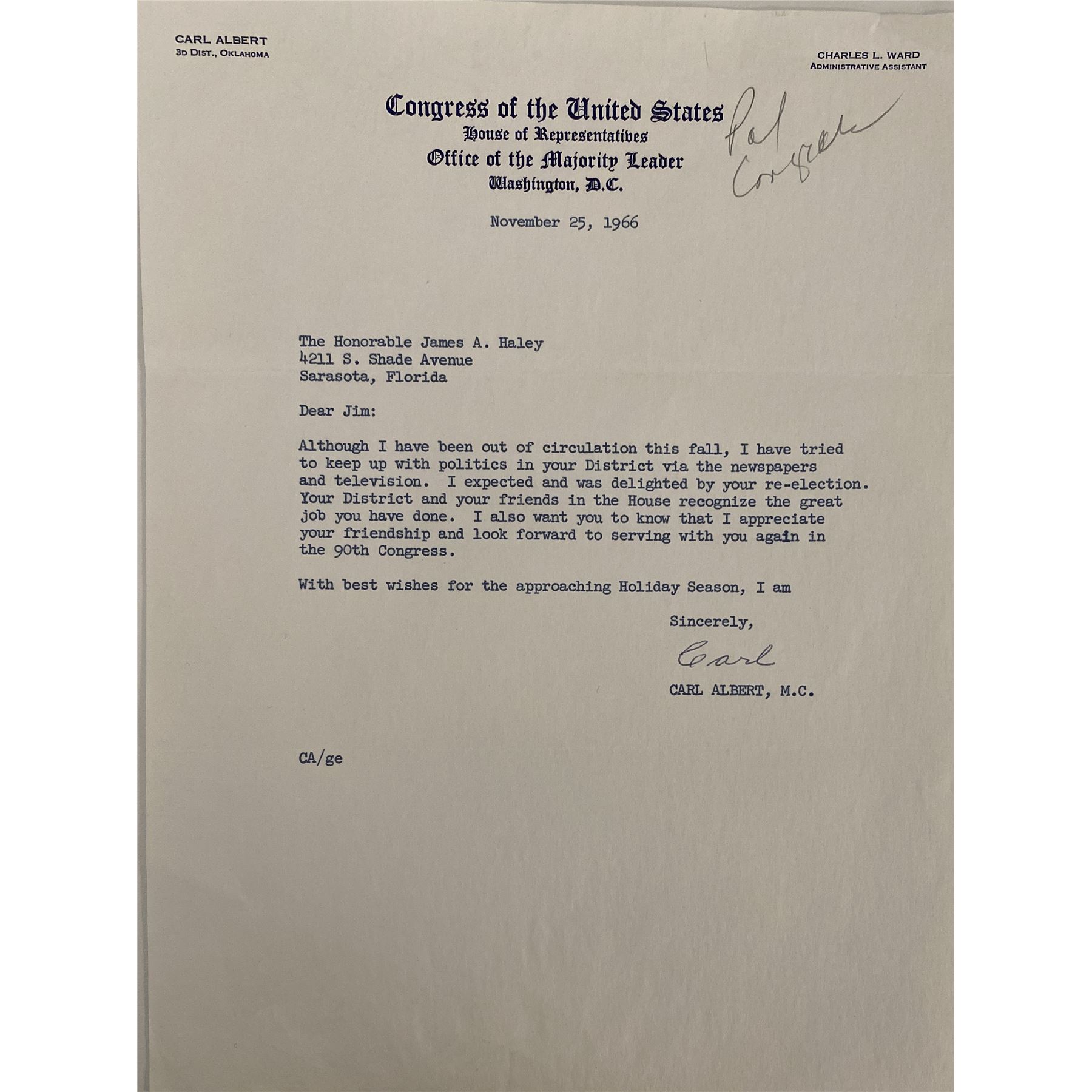 US House of Representatives Carl Albert signed letter. November 25, 1966 Washington D.C. 8x 10 inches