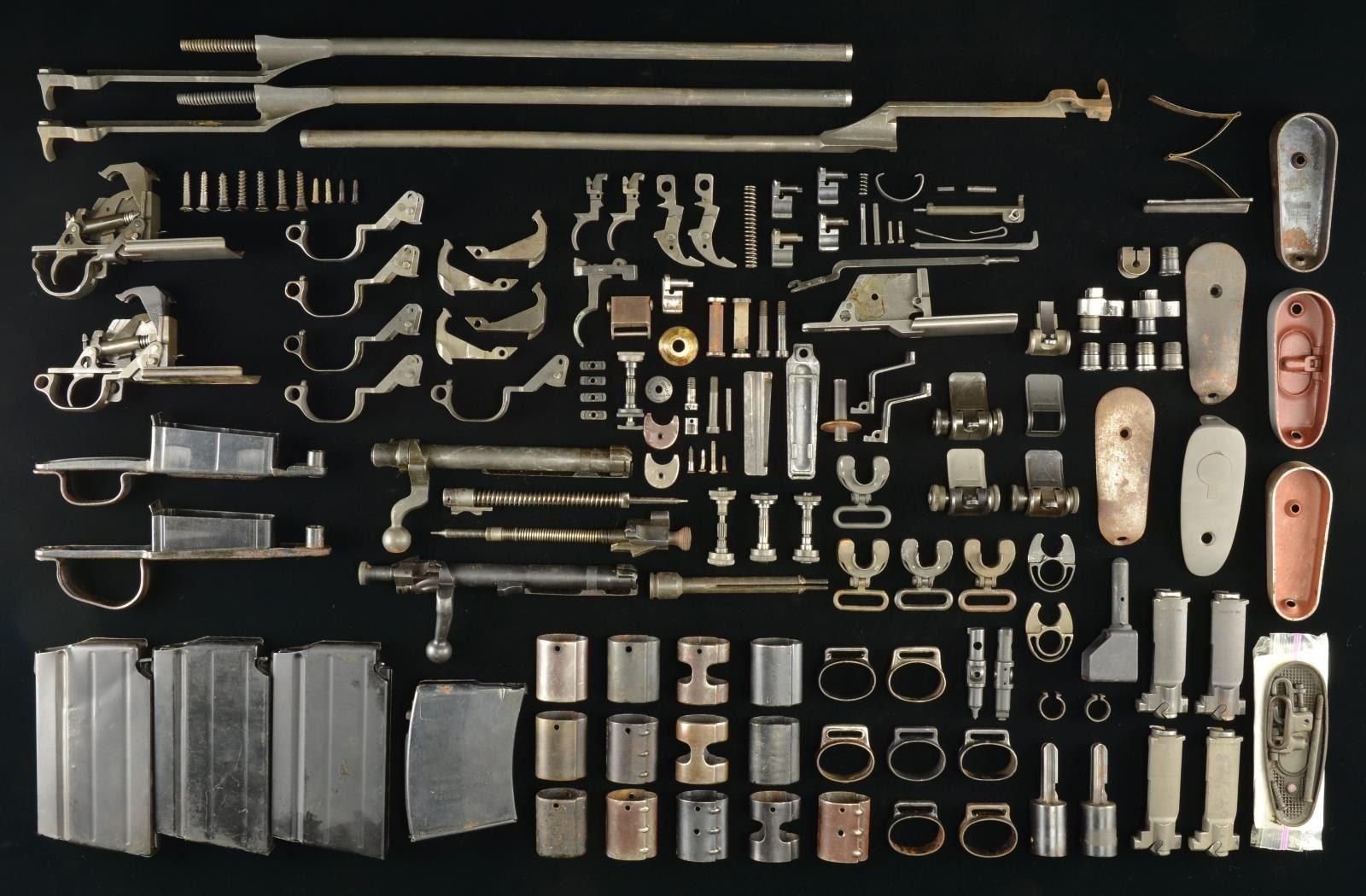 M1 GARAND: 3 Operating rods: 2 Remington National Match w/ springs, 1 Springfield. / 3 Rear sight assemblies. / 4 Bolt assemblies. / 2 Complete trigger assemblies along w/ other parts. / 3 Stock ferrules