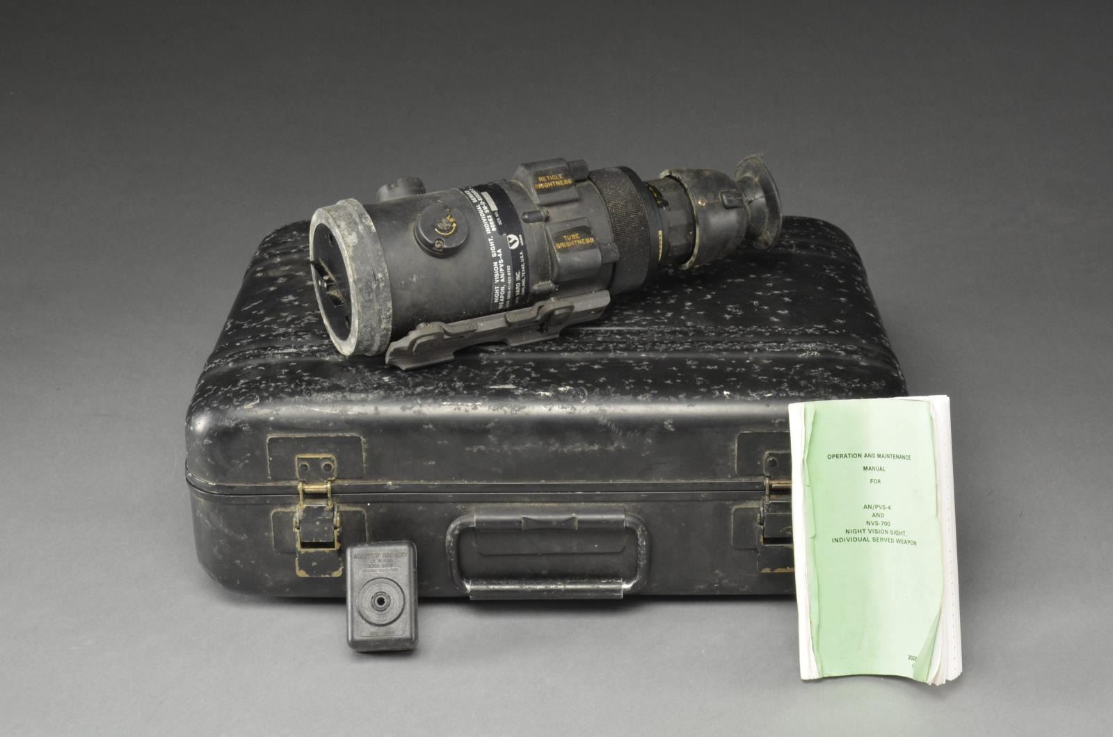 SIGHT. 1st generation Starlight sight first used in Gulf war & Iraqi war. Superceded by newer models, the sight was nonetheless an advance over earlier Vietnam era equipment. Mfg. 1977-78. Sight is approx. 3.6 power magnification weighing approx. 4 lbs. It is equipped w/ day/night adapter allowing daytime use. The sight was used on a wide variety of weapons including the M14 & M16 rifles, M60 MG & M67 recoilless rifle. Sight appears complete & includes adapter for 2 AA batteries. The attaching screw for the adapter is not present. Scope includes mt. w/ 2 locking levers. Scope also includes military issue padded metal case, operation & maintenance manual & matching inspection record dated 7-3-03. CONDITION: scope not tested for operation but appears to be complete. Rubber eye piece is intact. Scope has light wear & scattered handling marks w/ staining on rubber components. Case has light wear, scratches & spots of missing finish. (02-16079/RW). $200-300.