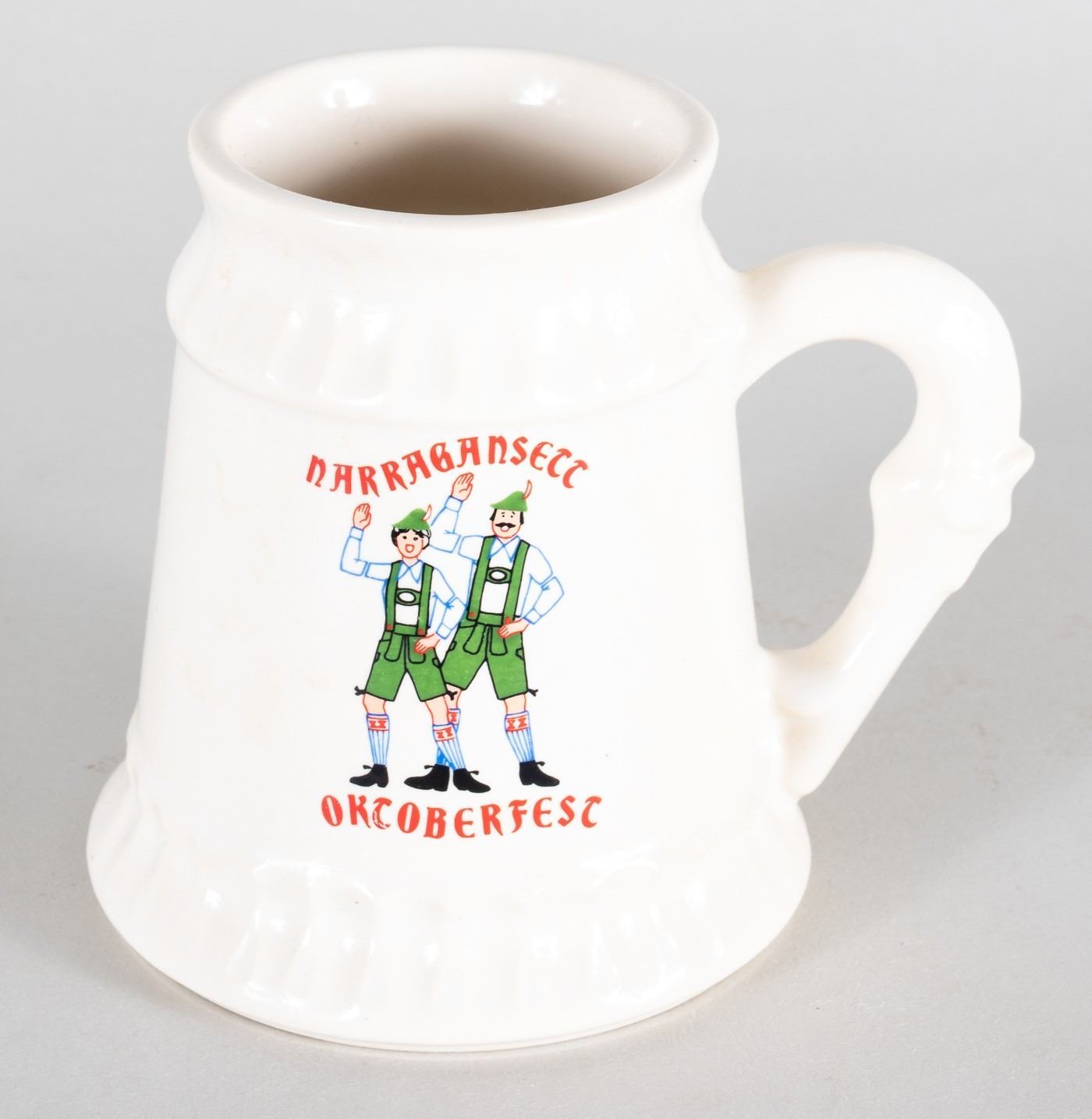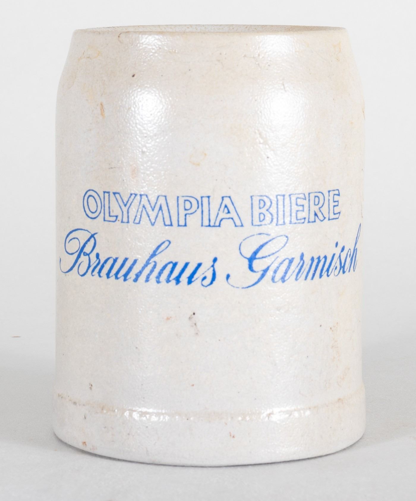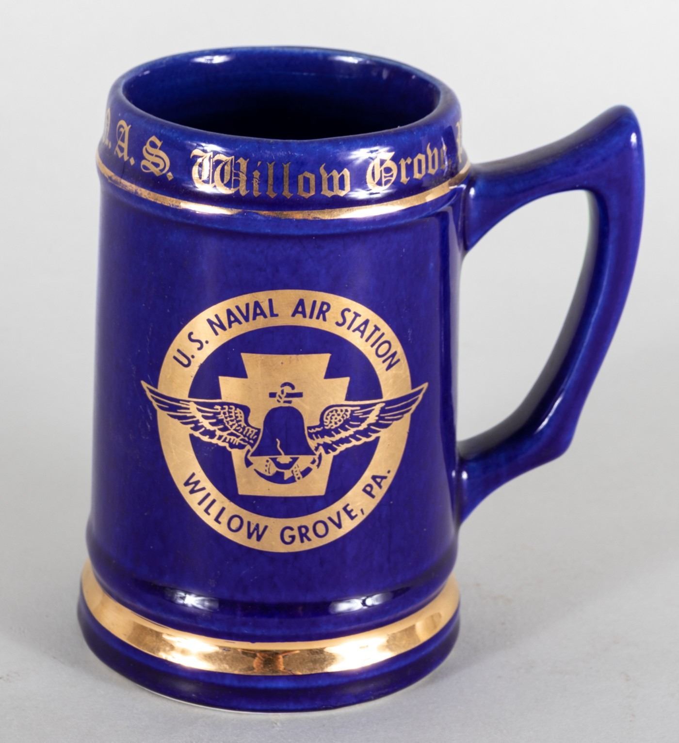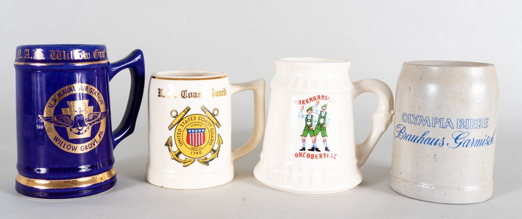 Lot of three ceramic beer steins. Steins are marked with 'U.S. Coast Guard', 'Narragansett Oktoberfest', 'U.S. Naval Air Station - Willow Grove, P.A.', and 'Olympia Biere Brauhaus Garmisch'. Approx. 5 inches tall. Approx. 3 inches in diameter at opening.