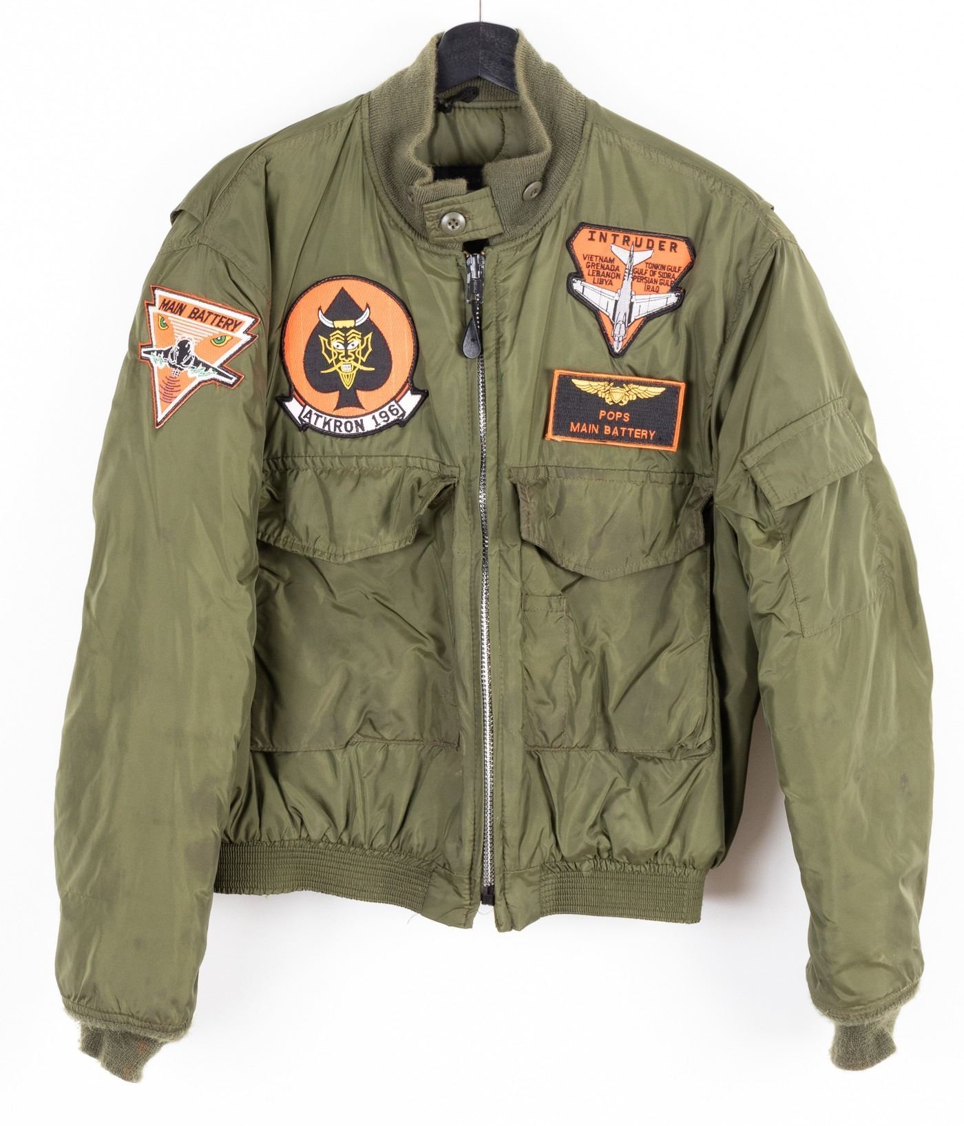 U.S. Navy jacket Type G-8, size 44, made by U.S. Navy, Bureau of Aeronautics. Not dated. Patches include Navy Attack Squadron VA-196, VA-196 Main Battery patch, Navy Intruder patch, and Pops Main Battery patch.