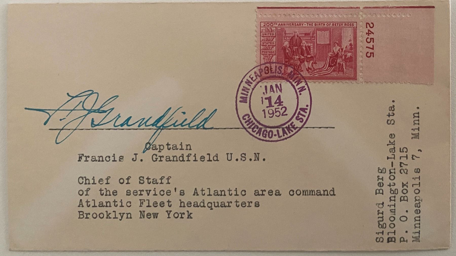 US Navy Captain Francis J. Grandfield signed 1952 cover - Minneapolis, MINN.6x4 inches