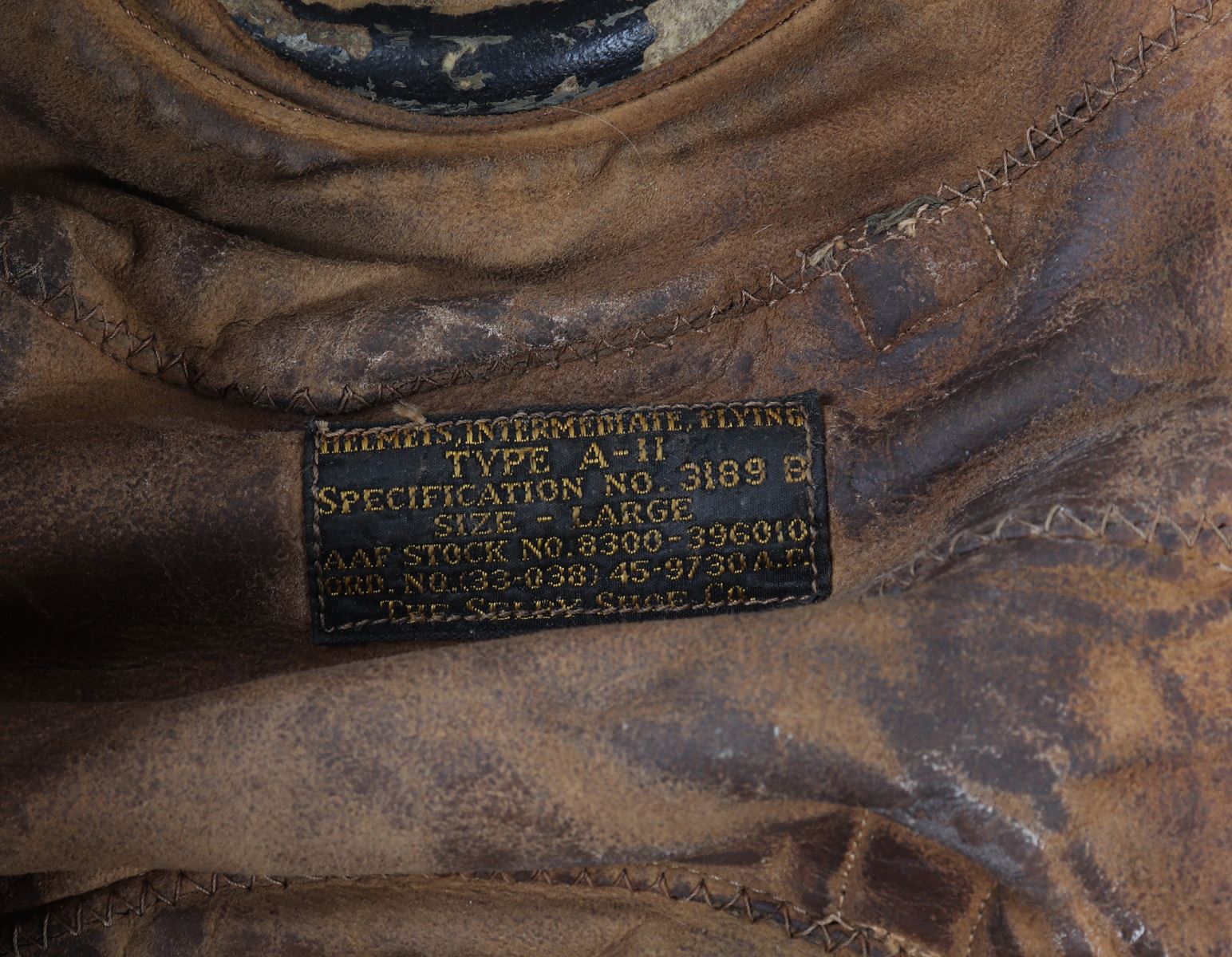 Helmets Intermediate Flying, Type A-11, Specification NO. 3189 B, Size - Large, AAF Stock No.8300-396010, ORD NO.(33-038) 45-9730 A.F., The Selby Shoe Co., Size 10" L x 7 1/4" H. Condition: Good condition overall with typical wear from age and use.. Provenance: Ex-Southern California Collection
