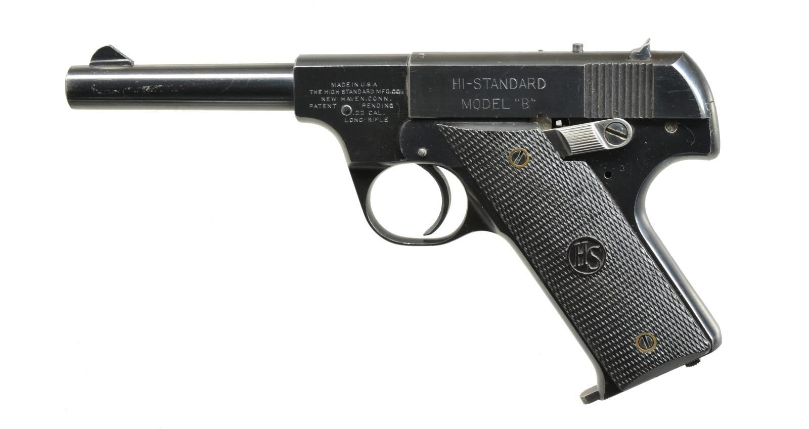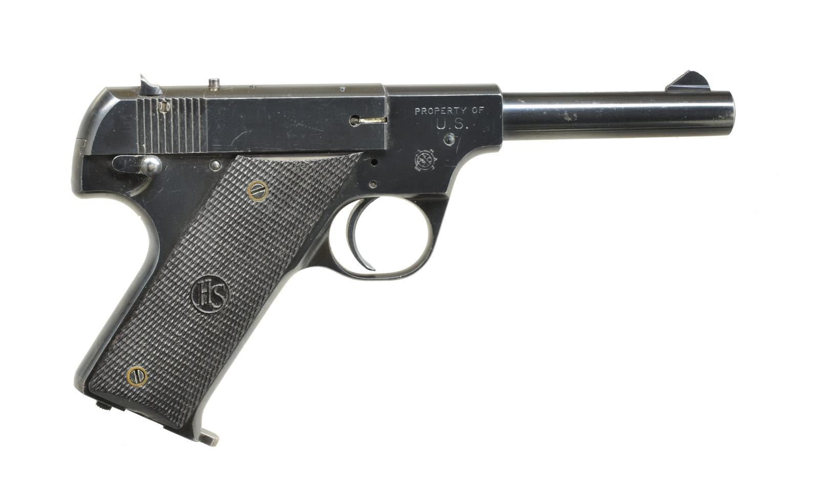 PISTOL. Cal. 22 LR. S# 109833. Bbl. 4 1/2" w/ serrated ramp front sight. Left side of frame marked "PROPERTY OF / U. S" over crossed cannon acceptance mark. 2 Piece checkered plastic grips. MAGS: 1 detachable 10 rd. CONDITION: over 90% blue showing edge wear w/ scratches & handling marks. Grips show light wear. Bright bore w/ sharp rifling. (20-3327/DS). CURIO. $500-800.