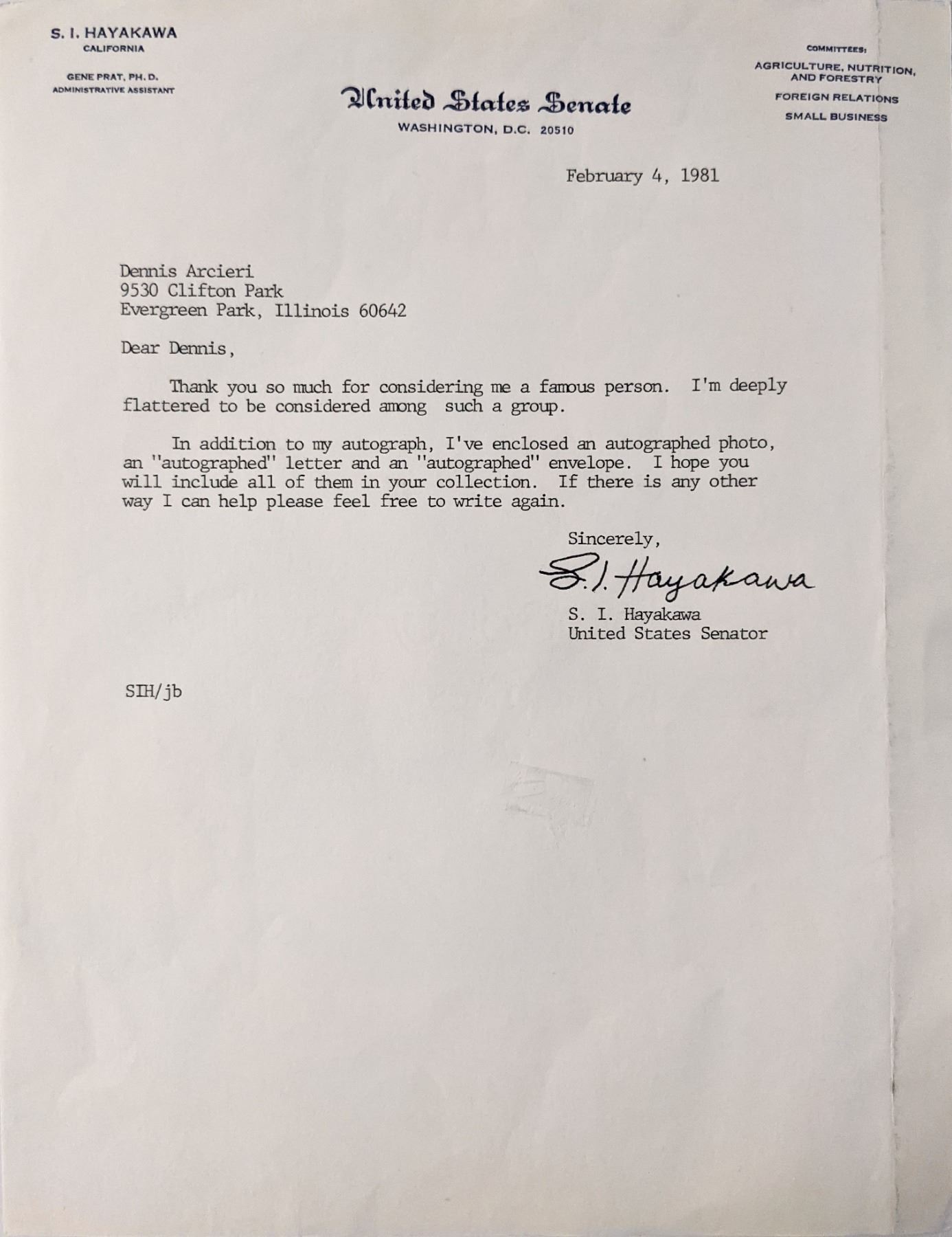 US Senator S.I. Hayakawa signed letter. 9 x 11 inches.