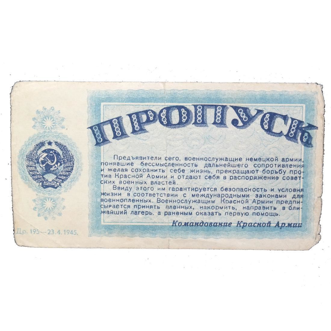 Wehrmachtangehrige, die diesen ausweis vorzeigen, stellen den Kampf gegen die Rote Armee ein und begeben sich in den Schutz der sowjetischen Militrbehrden, da sie die Sinnlosigkeit weiteren Widerstandes eingesehen haben und ihr Leben retten wollen, dated 23.4.1945, vertical center fold and rough edges, Fine+.