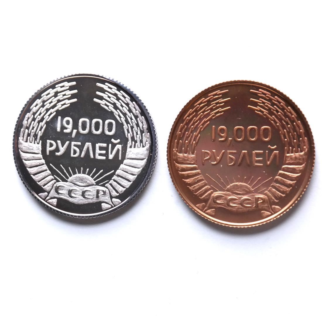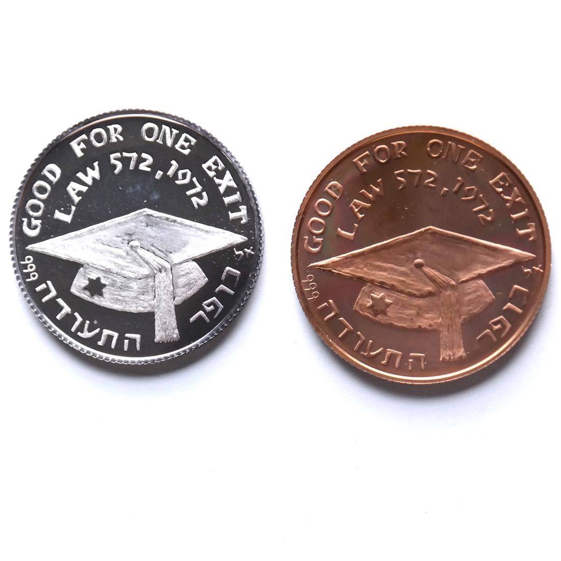 Designed by Avraham Lerner to commemorate the Soviet law allowing for permanent residence abroad in exchange for compensating the State for education received, in .999 fine copper and .999 fine silver, Proof condition. (Smythe NASCA auction of May 1988 lot #151 and #153)