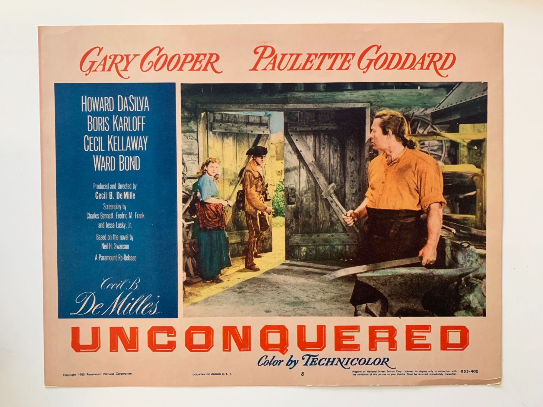 Unconquered original 1955R vintage lobby card on heavy card stock. 11x14 inches