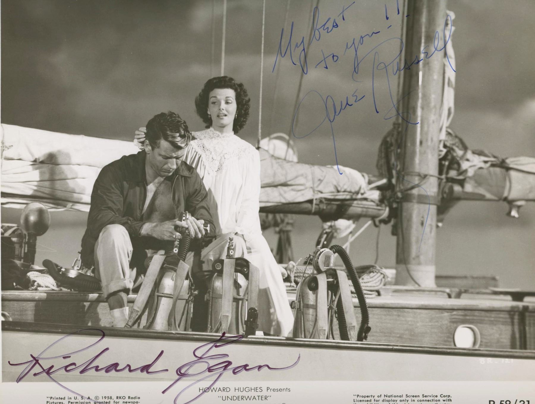 Underwater signed movie photo autographed by Jane Russell‎ and ‎Richard Egan. 8x10 inches