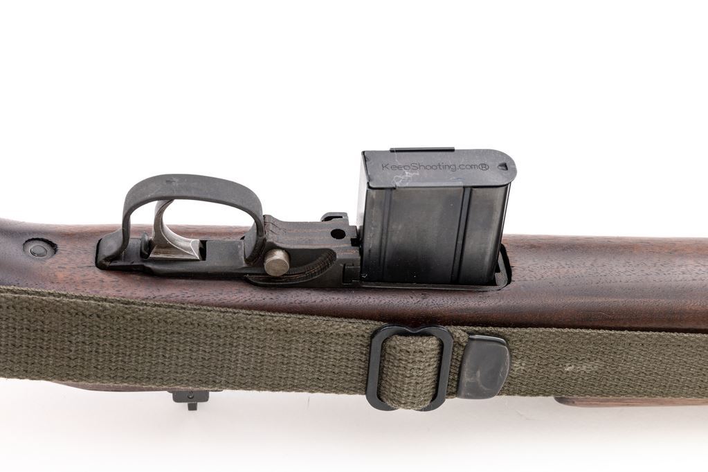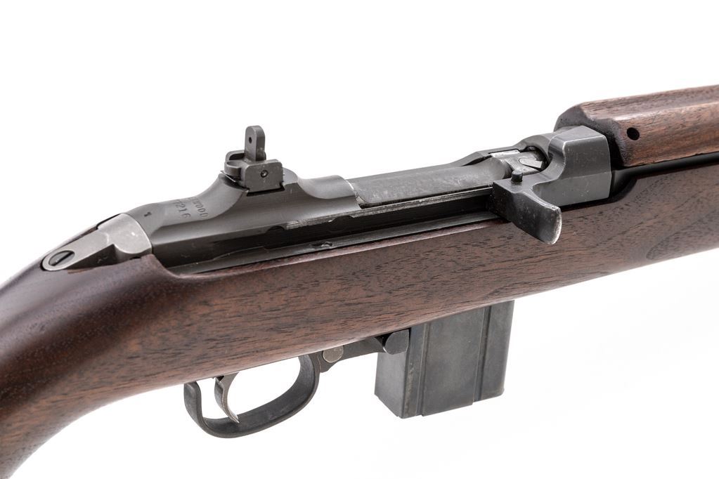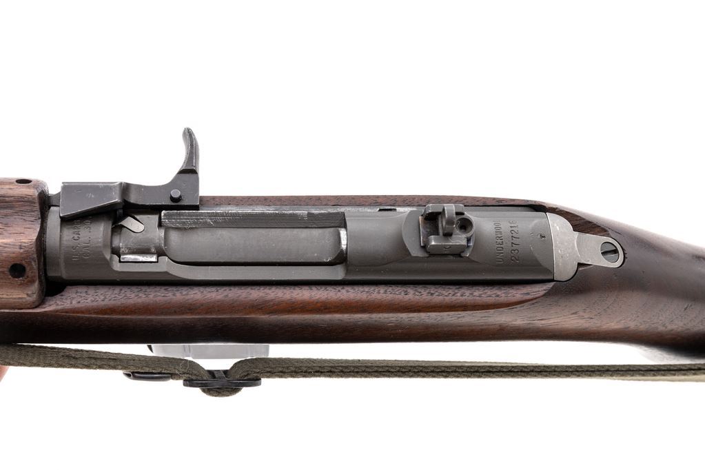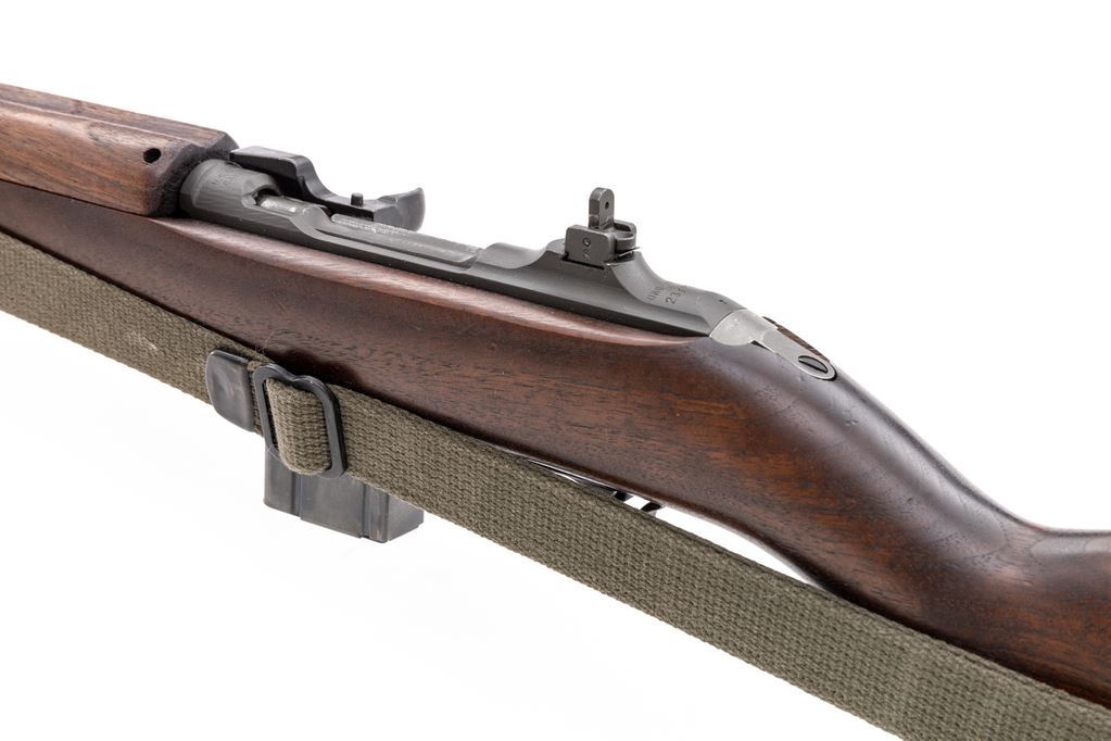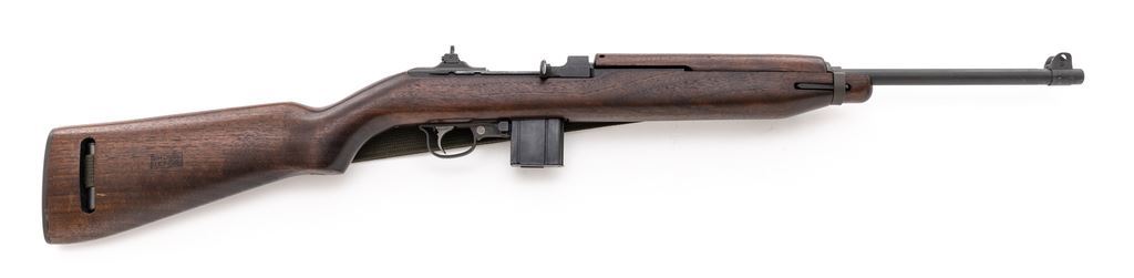 Underwood Semi-Automatic Carbine, #2377216, .30 Carbine cal., 18" barrel, parkerized finish, walnut stock, blade front sight with protecting ears and two-position flip rear sight. Marked on receiver ring "U.S.CARBINE CAL..30 M1". Receiver tang is marked "UNDERWOOD", and barrel behind front sight is marked "UNDERWOOD" and faintly "4" over (flaming bomb). Stock is a possible commercial replacement and is stamped with a "flaming bomb" in the sling slot, "(circle)/P" firing proof on end of pistol grip, and boxed "G.H.D./U.E.F/(crossed cannons)" cartouche on right side buttstock. Front band assembly and rear sight are also possible commercial replacements. Includes a green cotton sling & oiler and a commercial magazine marked "KEEP SHOOTING". Condition overall is very good with approx. 95 % of the parkerized refinish remaining on the metal. Stock has a chip missing from the right side of the tang, otherwise wood is very good showing light handling marks. Action is smooth, bore is fair with darkening and light pitting toward the muzzle, showing good rifling. No visible import marks. Est.: $900-$1,200. (C&R/PPT)