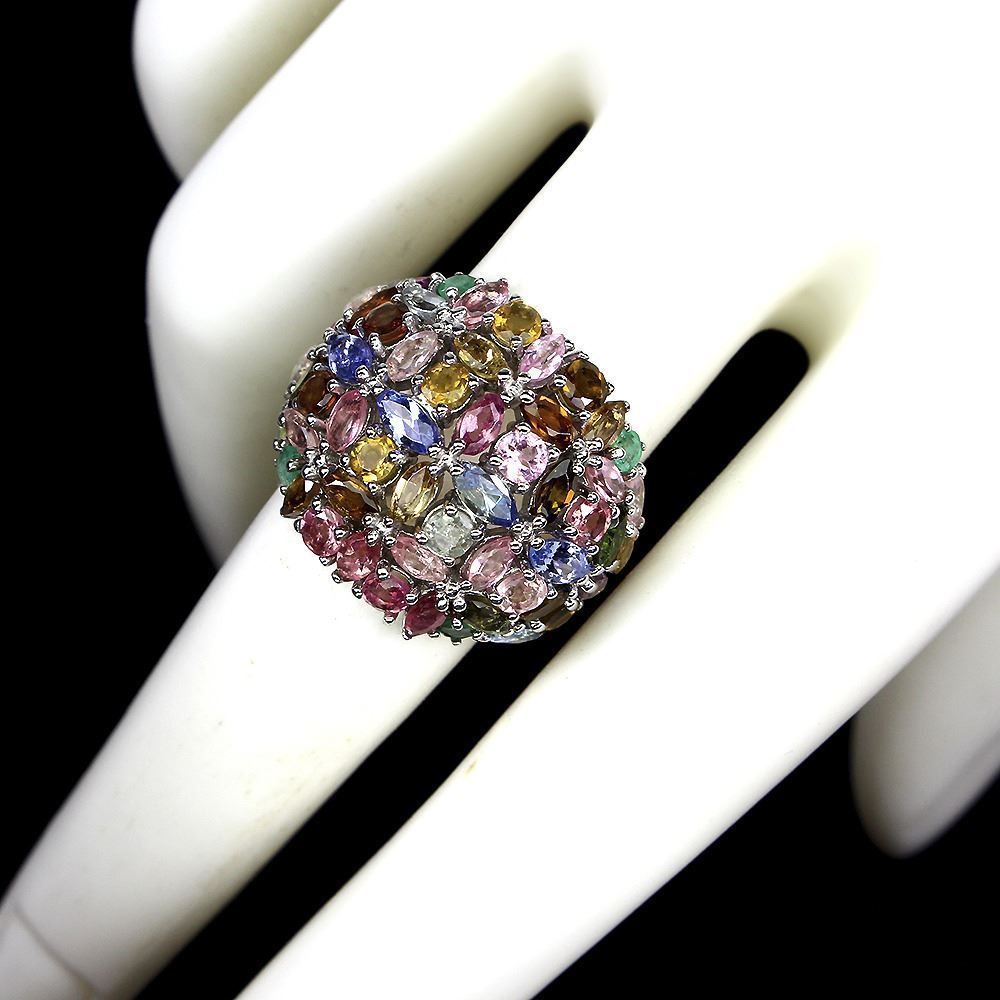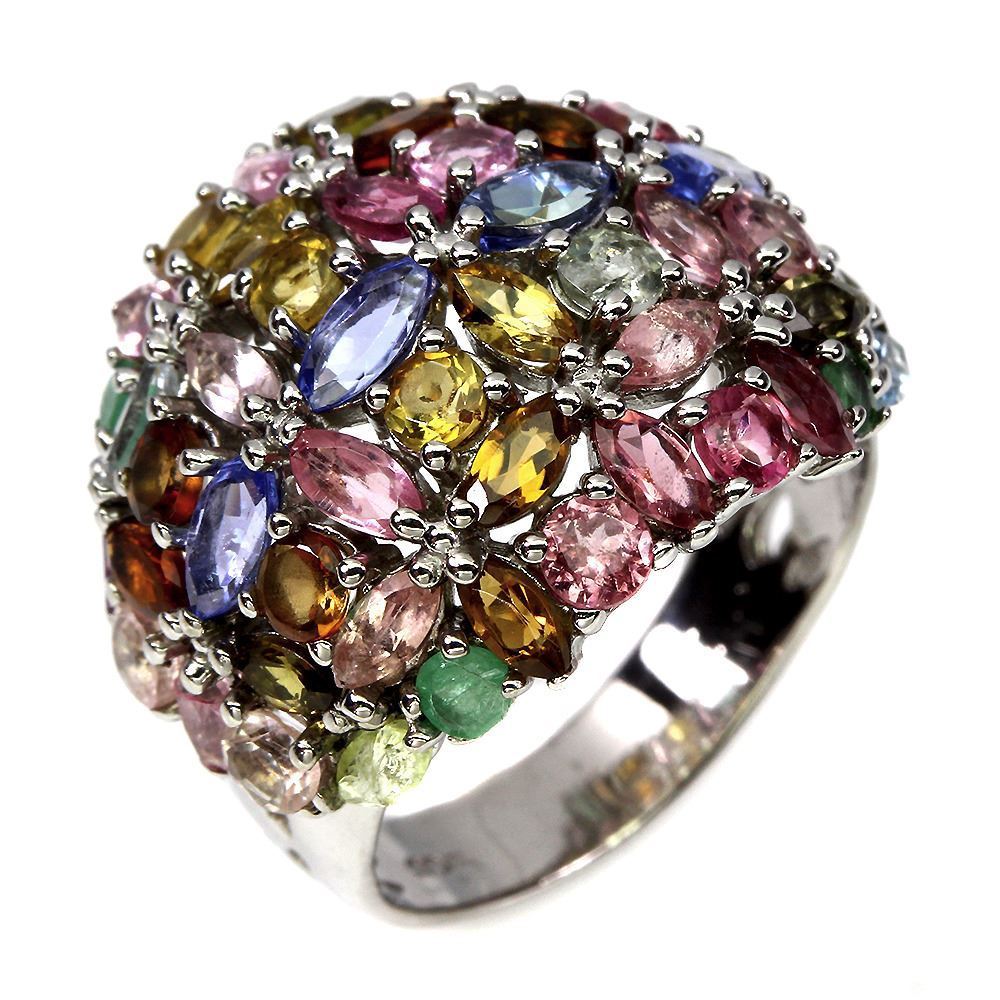 Unheated Marquise Tanzanite Emerald Tourmaline 14 k White Gold over 925 Sterling Silver Ring Size 8