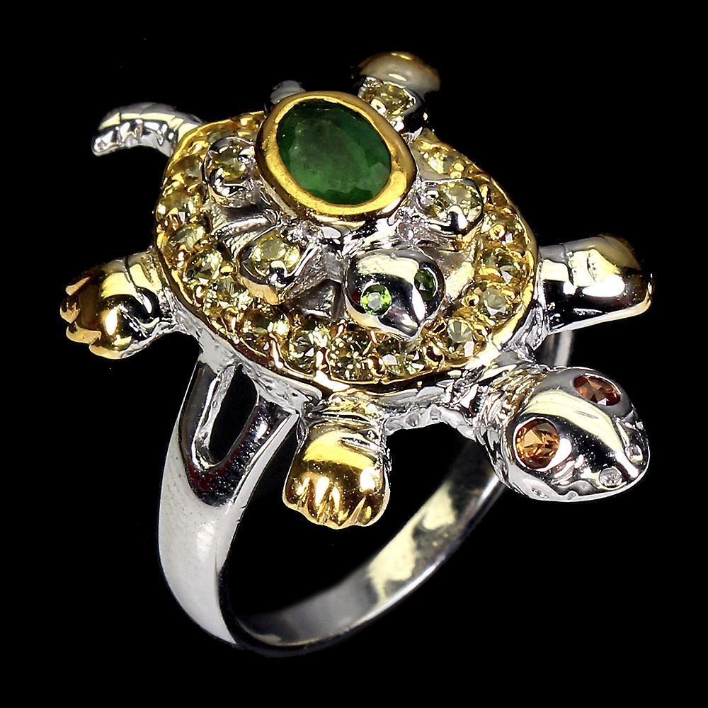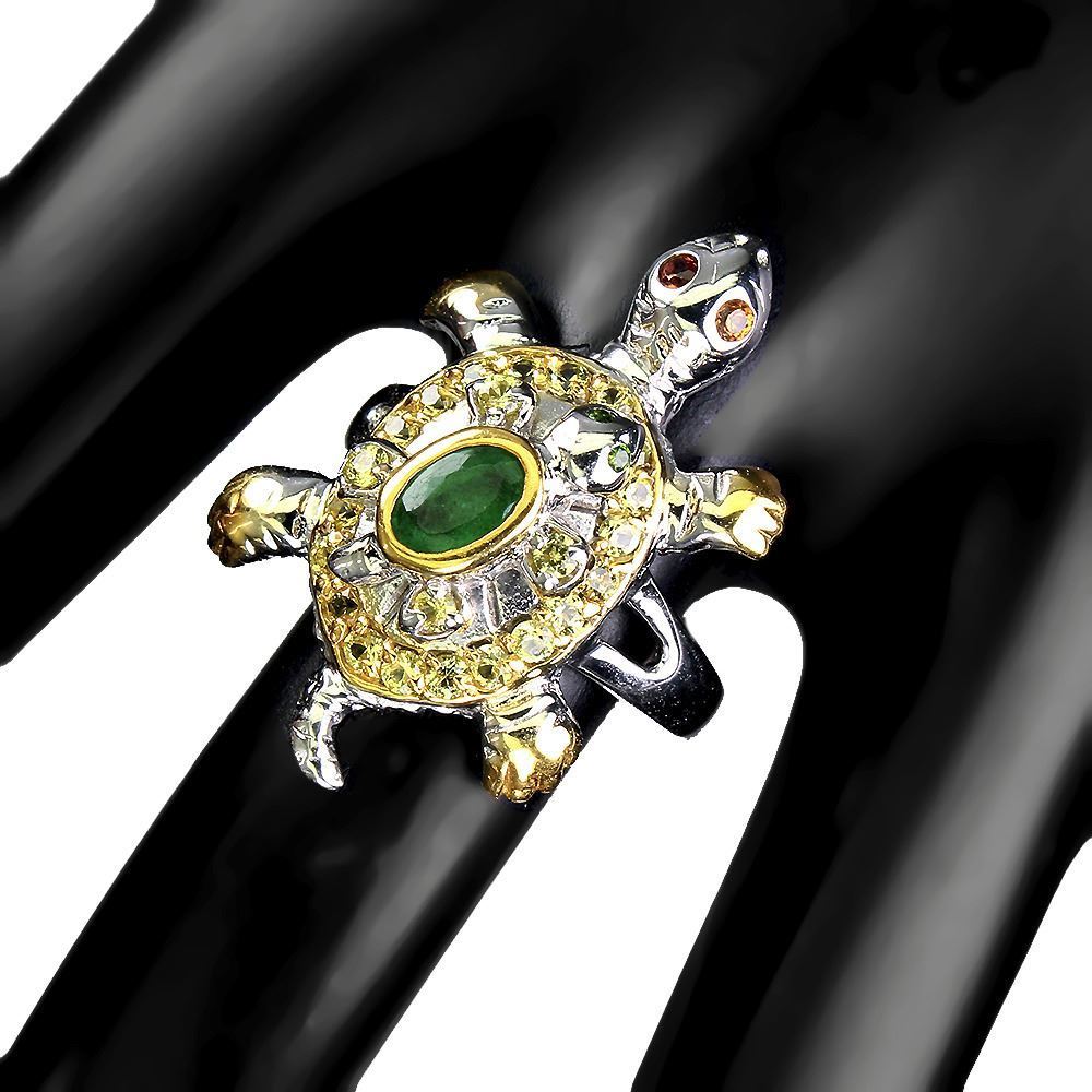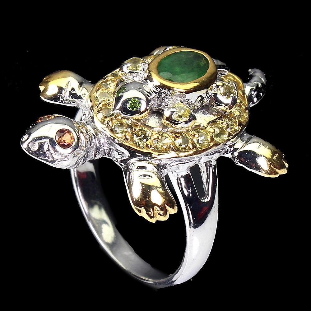 Unheated Oval Emerald 6x4mm Sapphire Gems 14 k White Gold Plated 925 Sterling Silver Turtle Ring Siz