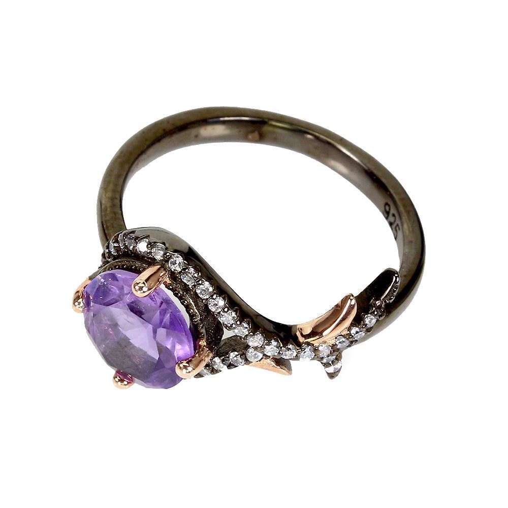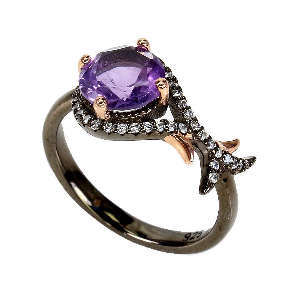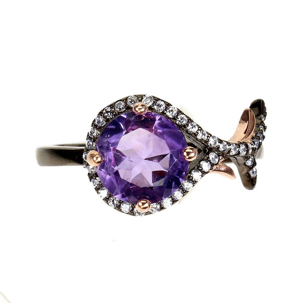 Unheated Round Purple Amethyst 8mm Cz 14 kRose Gold and Rhodium Plated 925 Sterling Silver Ring Size