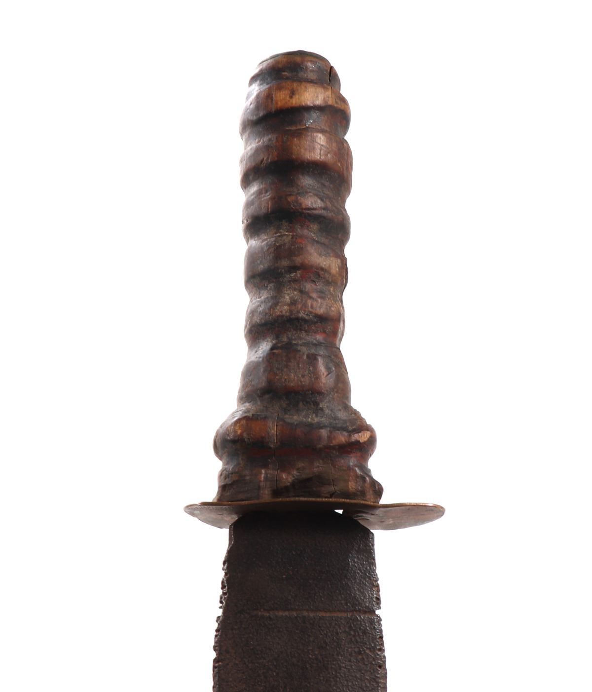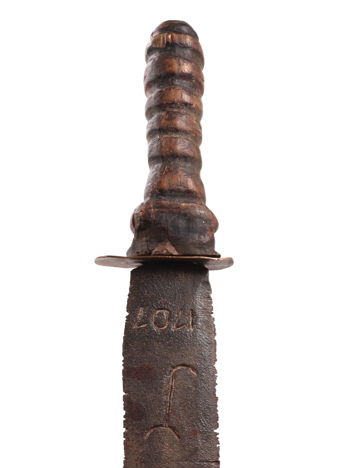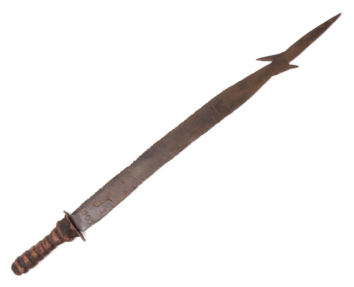 Hand crafted headhunter's sword with a ribbed wood handle and heavy steel blade. Inscribed 1707 and initialed J likely the maker or who is was fashioned for. Unique downturn and upturn spikes made into the blade similar to a harpoon with a sharp point. Size 29 1/4" L. Condition: Rust, patina and wear throughout commensurate with age and use.