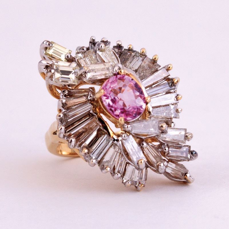 Description: 1.95 carat Pink Sapphire, Diamonds weighing 5.00 carats total (all weights approximate).