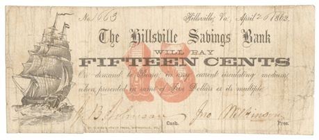 VA. 1862 15 Cents Hillsville Savings Bank Obsolete Note