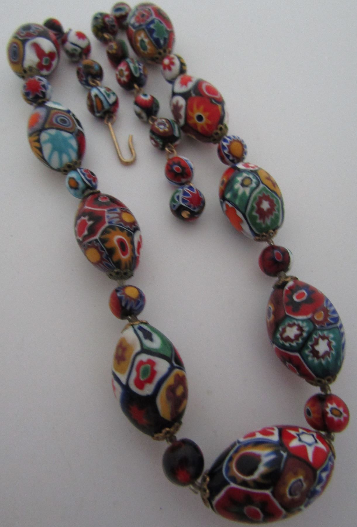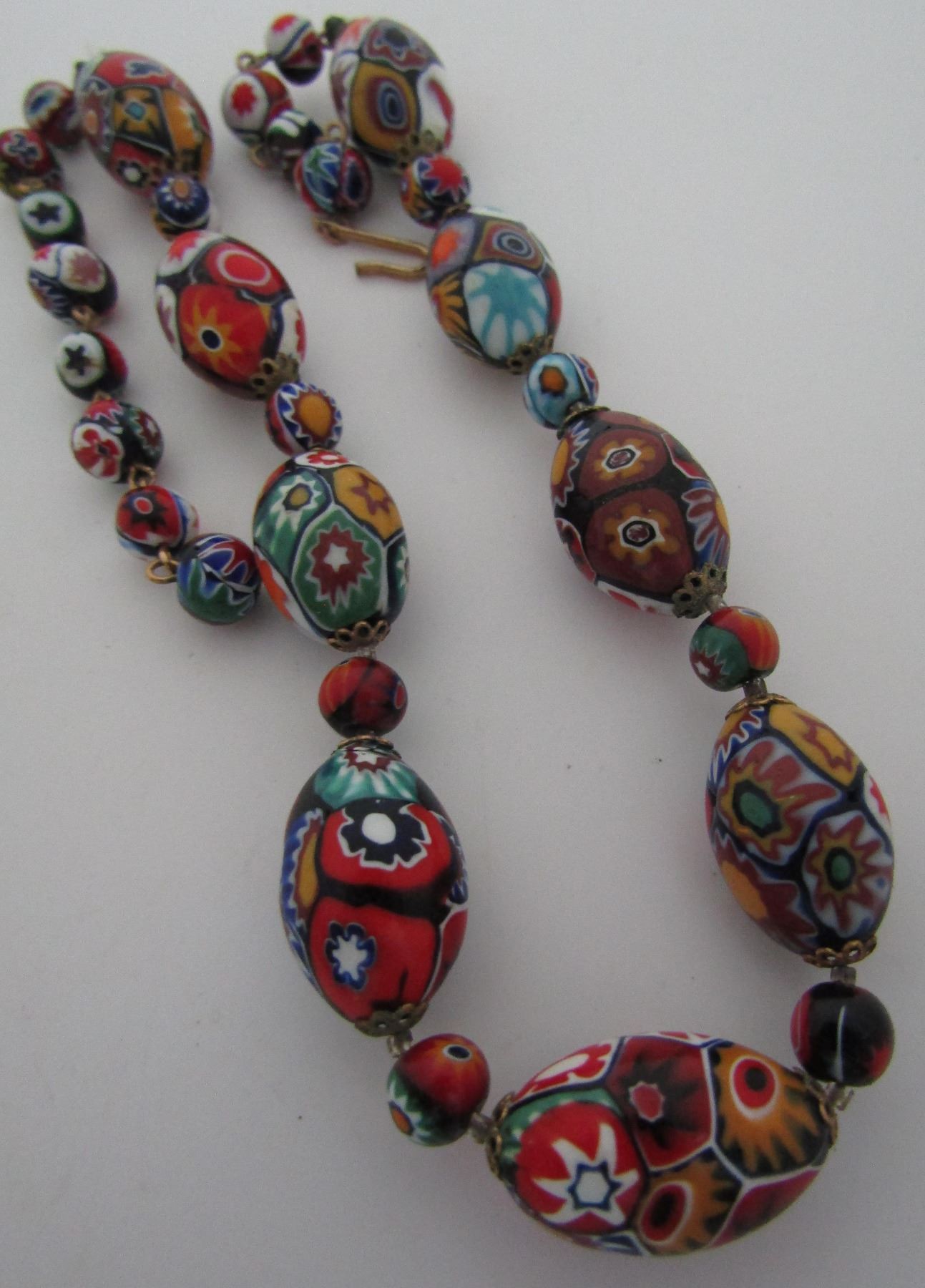 VINTAGE ESTATE ITALIAN 18" LONG END OF DAY GLASS BEADS 25MM BY 14.7MM. WEIGHS 72.0 GRAMS. 8MM ROUND BEADS, SMALL CLEAR BEADS & METAL FILIGREE SPACERS. USA SHIPPING $5.