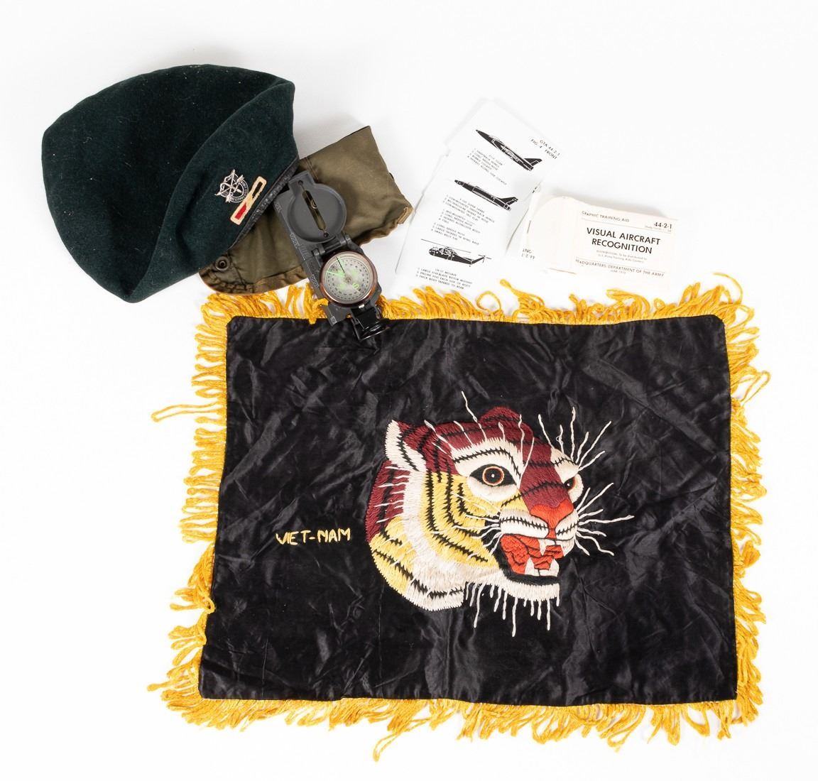 Lot of four Vietnam War soldier items. A Green Beret with U.S. Army Special Forces pin, 'De Opresso Liber', compass of unknown origin with pouch, visual aircraft recognition training cards dated June 1970, '44-2-1', and a Vietnam Tiger pillow sham. Pillow sham is 15.25 x 19.25 inches. Training cards are 2.5 x 3.5 inches. Minor soiling on card pack.