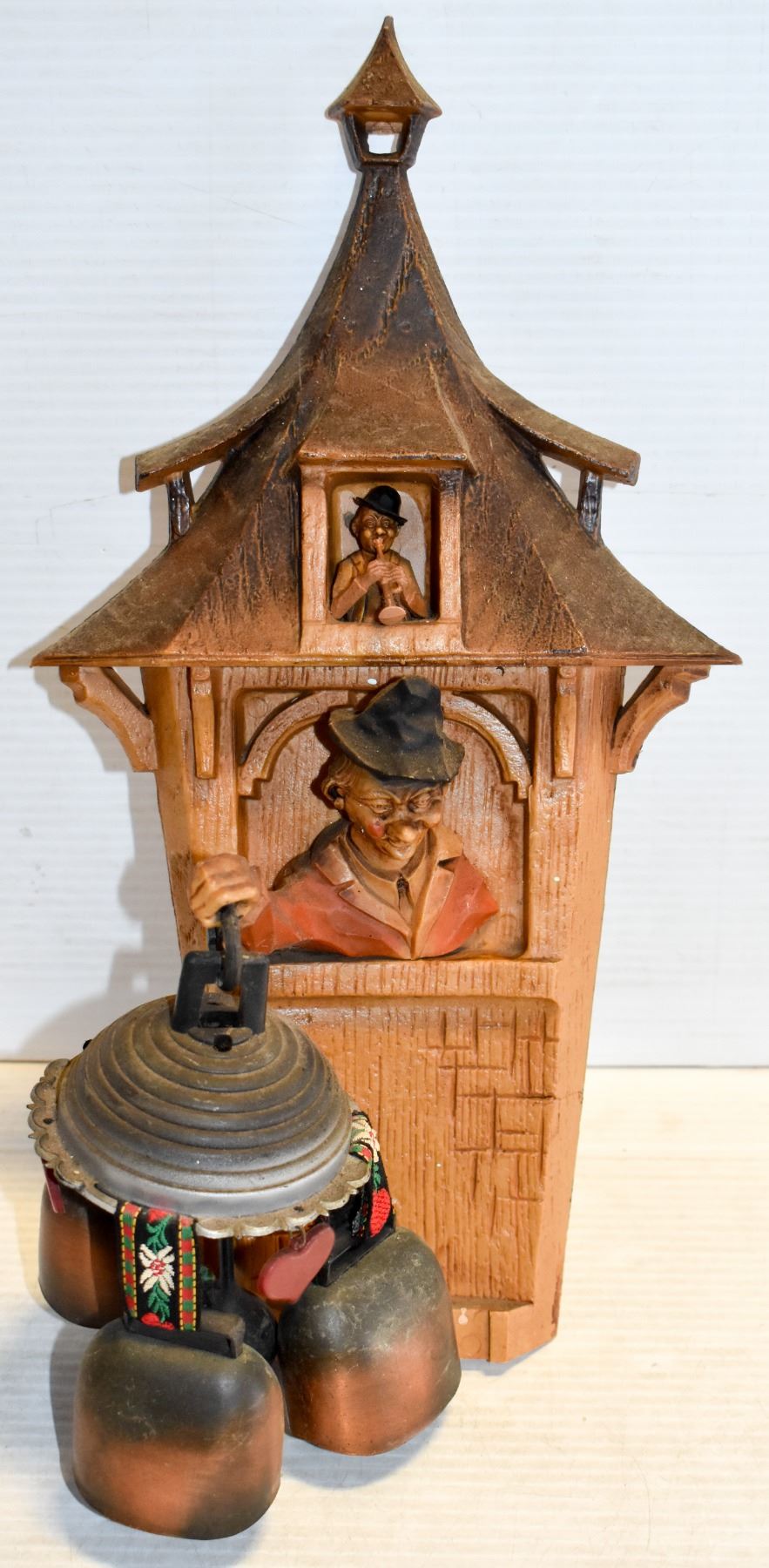 HANGING PLASTIC MAN PIPER WITH 3 MINI COW BELLS ATTACHED