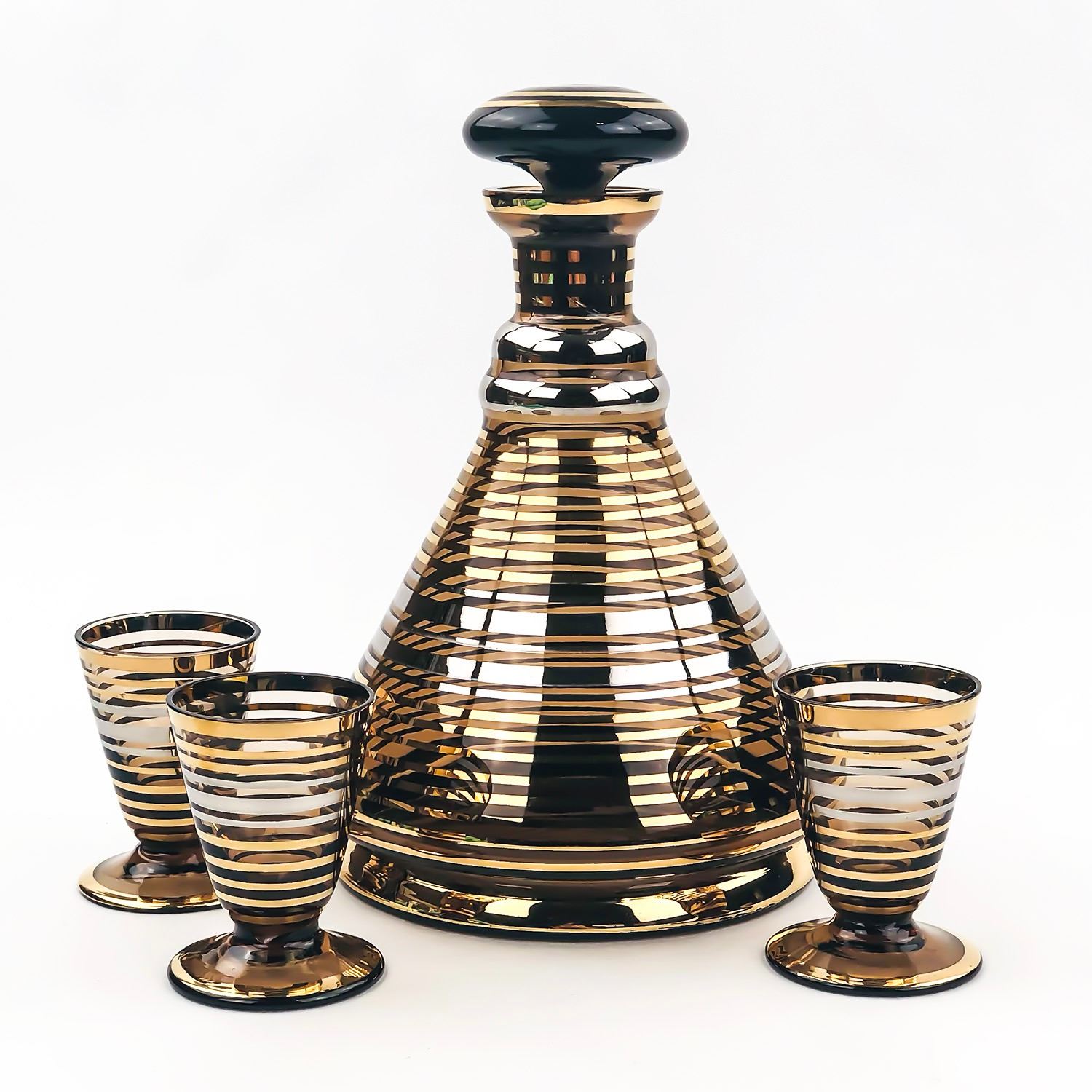 VINTAGE AMBER DECANTER WITH GOLD & SILVER BANDS