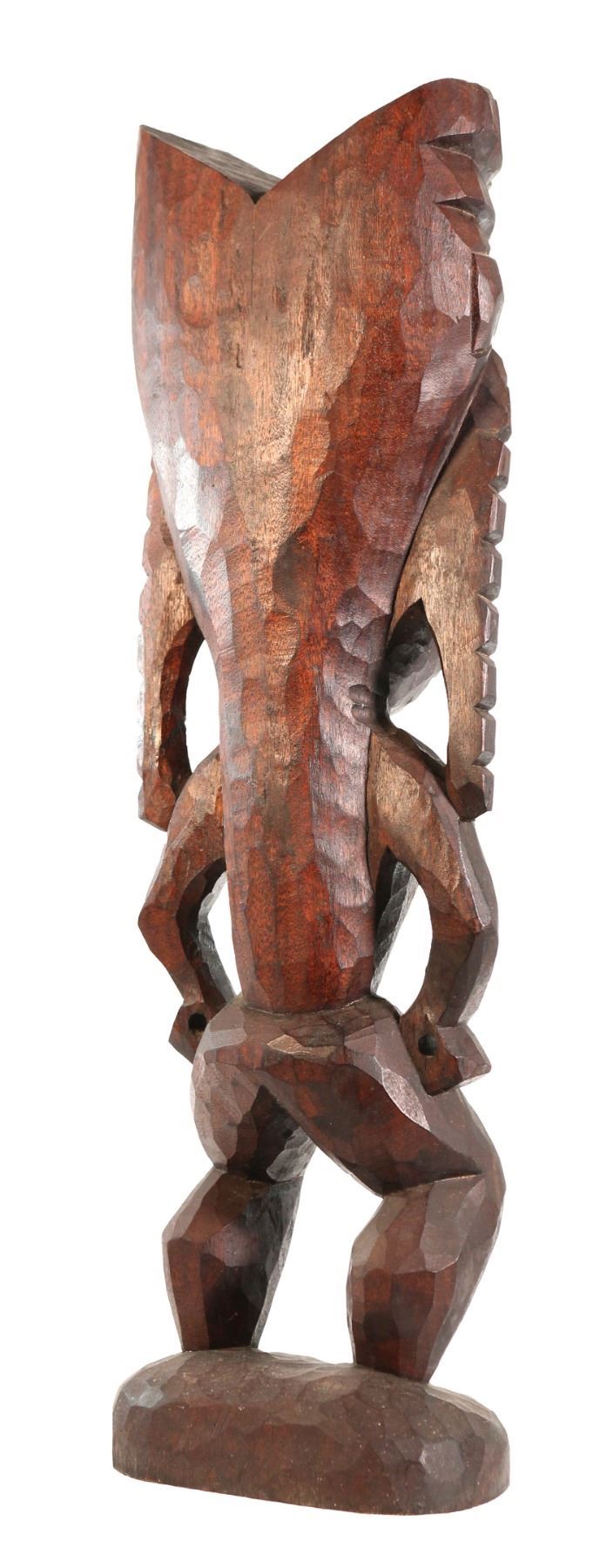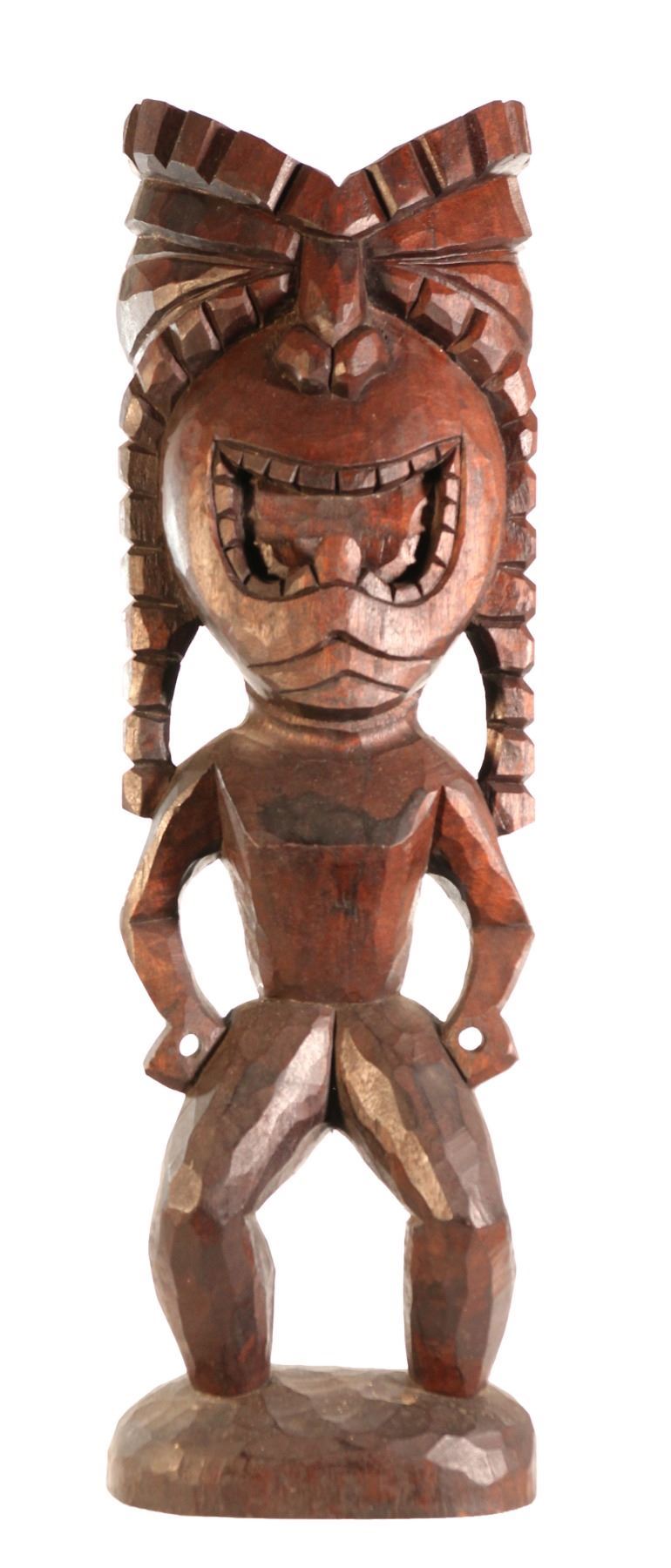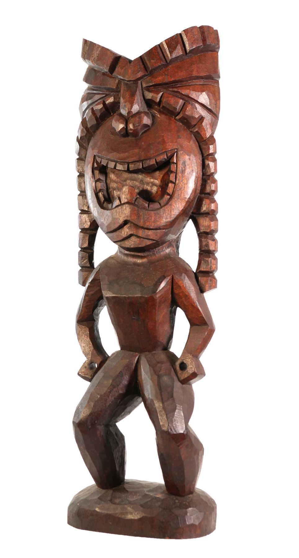 (1960s) Unique, large carving in dark wood of a screaming Hawaiian Ku War God Tiki. Features exaggerated, wide mouth and open air fists and stands upon its carved round base. Solid wood. 29.5"x9.5". VG+.