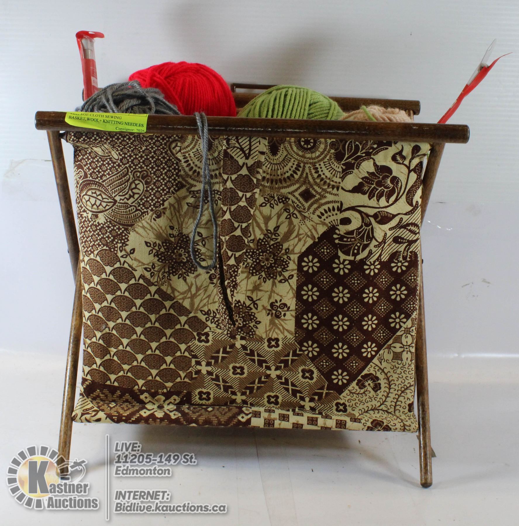 VINTAGE CLOTH SEWING BASKET,WOOL+ KNITTING NEEDLES