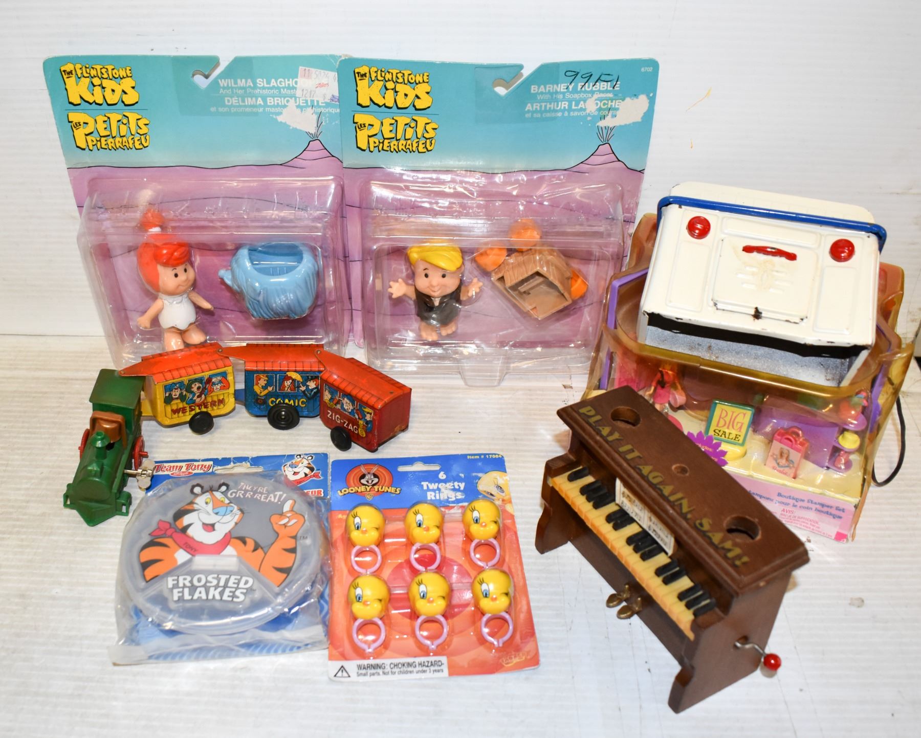 STAMPER SET 2001 #18680 (CONTENTS SEALED), ENESCO 1978 MUSICAL WOOD PIANO, METAL MINI STOVE, (2) SEALED COLCO THE FLINSTONES BARNEY RUBBLE & WILMA SLAGHOOPLE & RUSS BERNIE METAL TRAIN WITH KEY & MORE