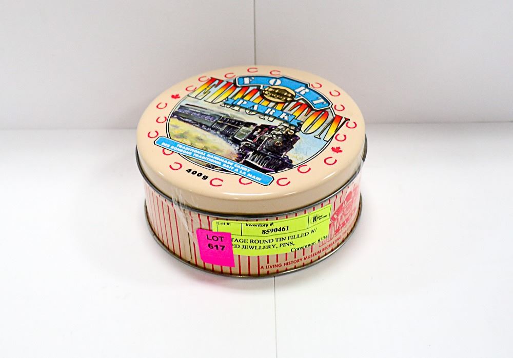 VINTAGE ROUND TIN FILLED W/ MIXED JEWLLERY, PINS,