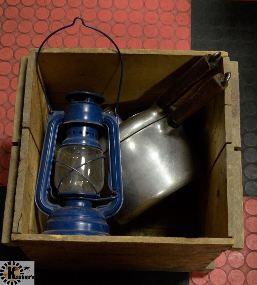 VINTAGE WOOD CRATE, PRESSURE COOKER AND FARM