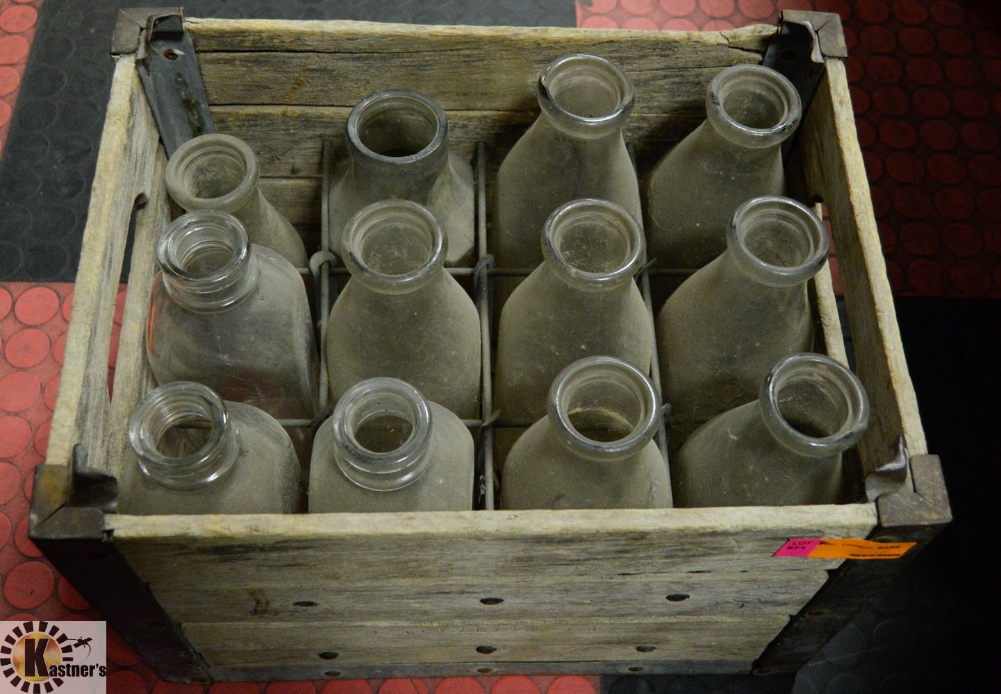 VINTAGE WOOD & METAL CRATE WITH BOTTLES