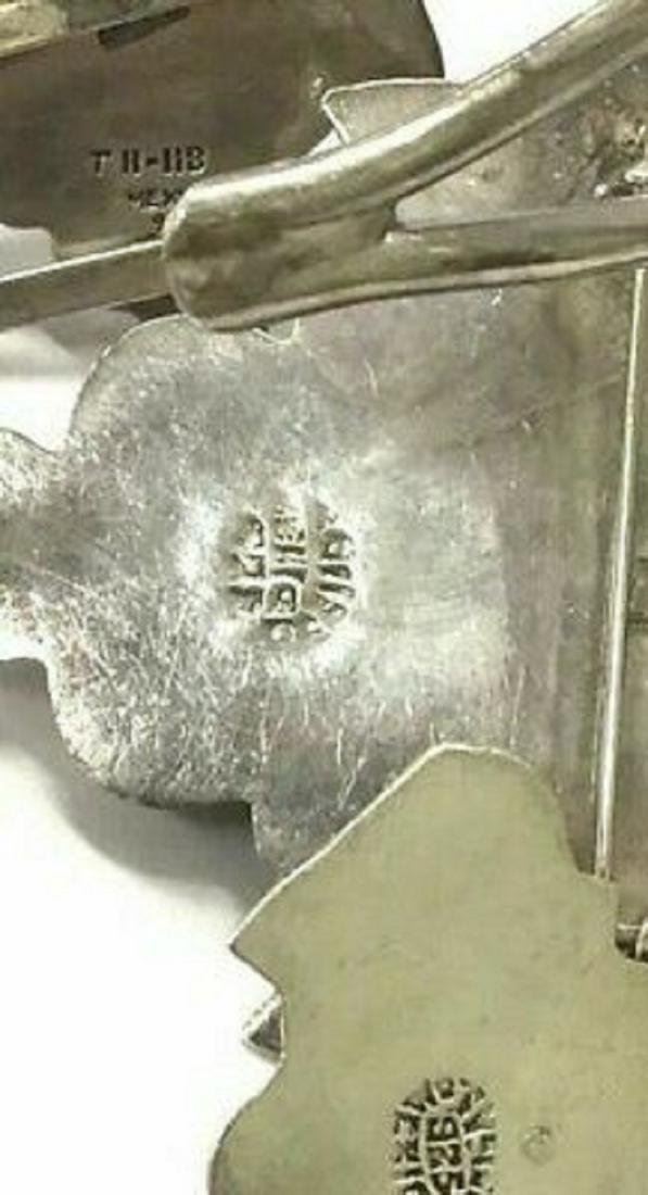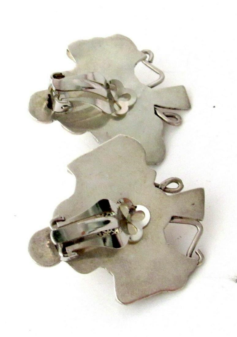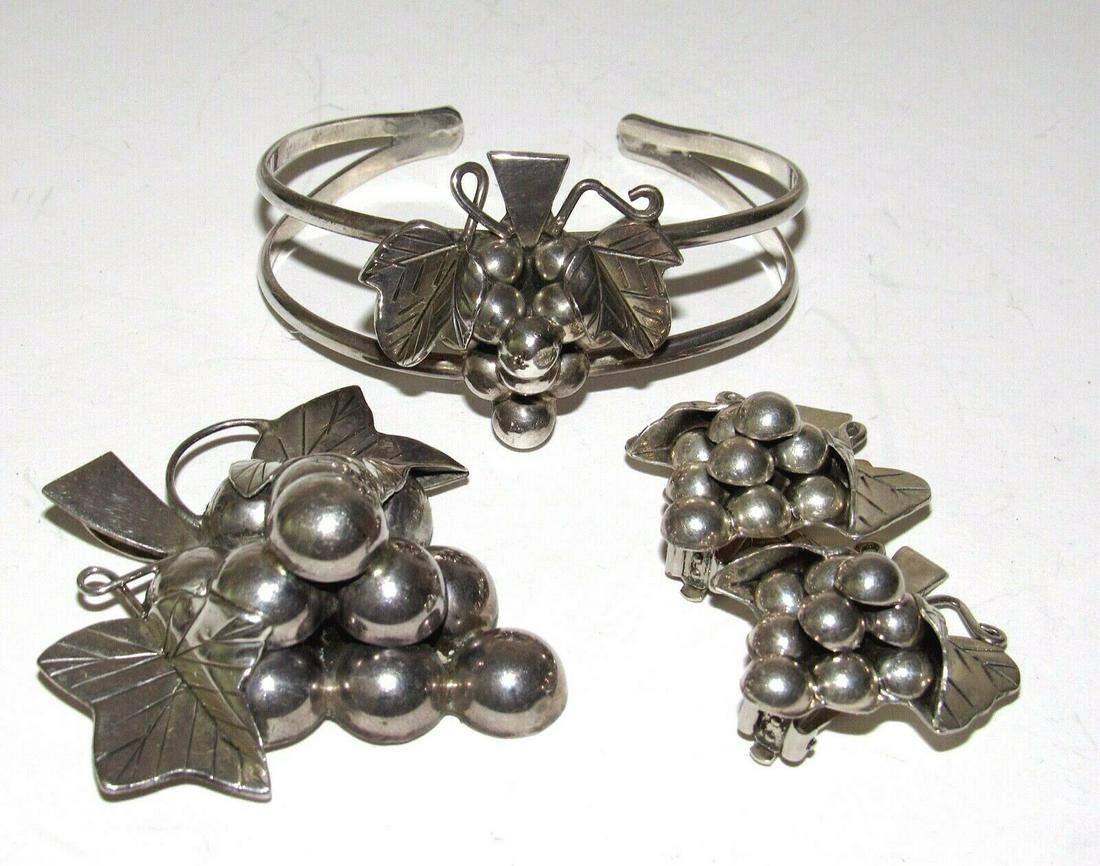 Wonderful Taxco Mexico 925 sterling silver 3D Grape design jewelry set. The set includes a bracelet, pin/pendant and a pair of clip on earrings. Stamped Mexico, 925 and feature artisan's individual hallmarks. Measurements: Cuff bracelet: 6.5" Earrings: 1" Brooch: 2" Number of Pieces: 3Gorgeous vintage Taxco set to add to any jewelry collection!